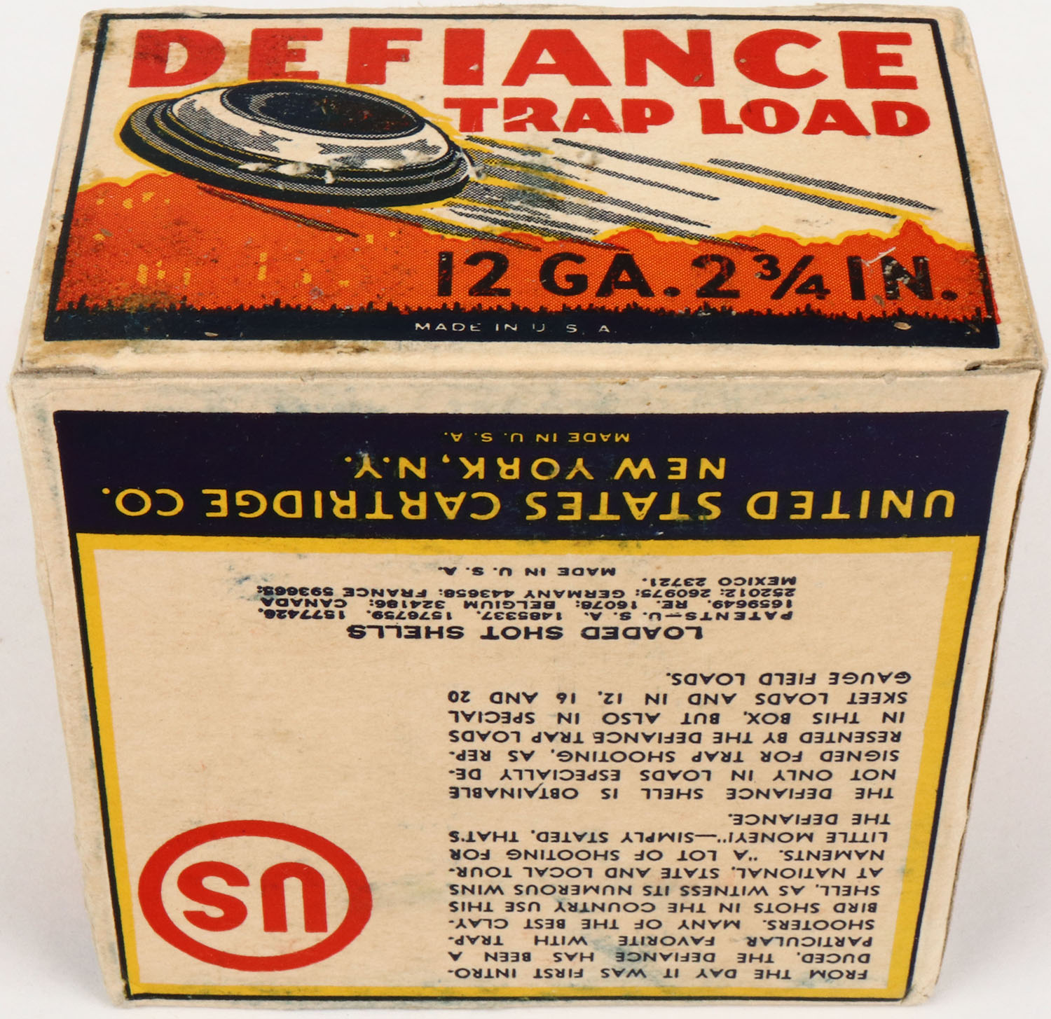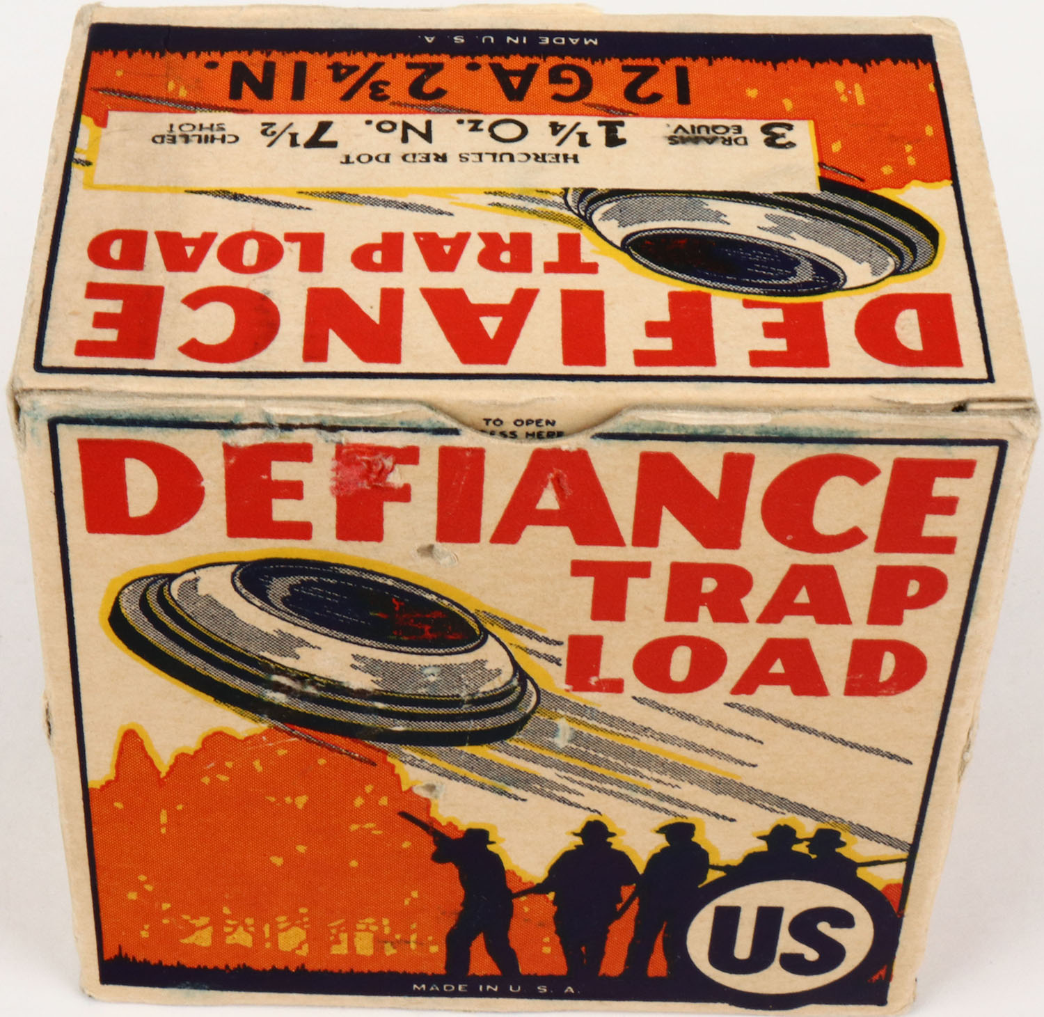 US Cart. Co., Defiance TRAP LOAD, 12ga., 1pc., Full, shot size 7 1/2 Chilled Shot, 2 3/4 IN., white, blue, black, orange and yellow box, great graphics showing a Trap shooting scene, box has light soiling with light scuffing on front side of box. Shells are very good. Grade: Excellent + - Value: 300 to 1000