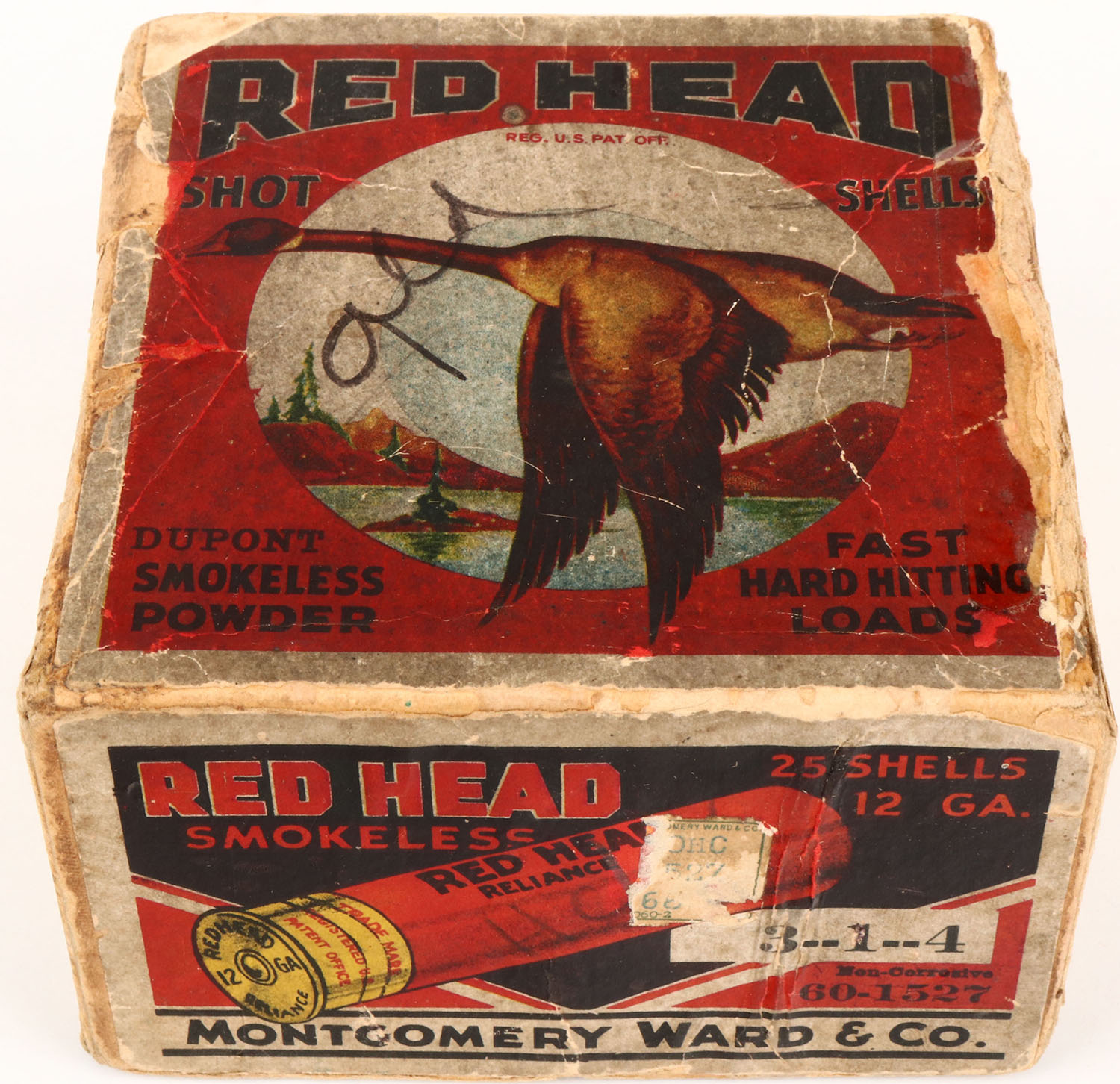 Montgomery Ward & Co., Red Head, Reliance, 12ga., 2pc., Empty, 4 shot, buff box with multi colored scene & single goose flying, box has edge wear, tape repairs, age soiling, some scuffing. Box has tears on right side of box. Grade: Very Good + - Value: 70 to 200