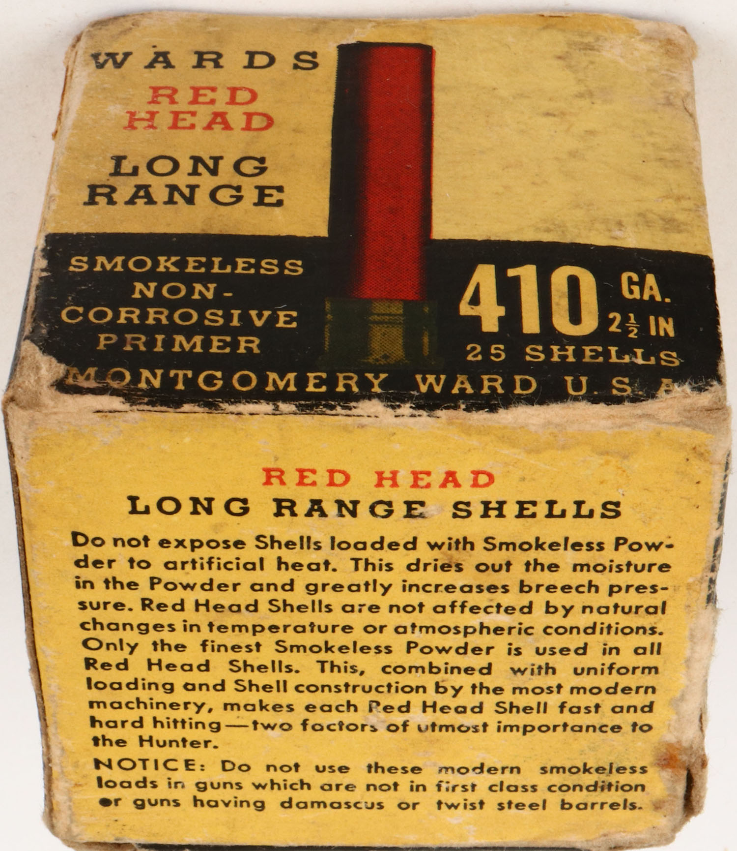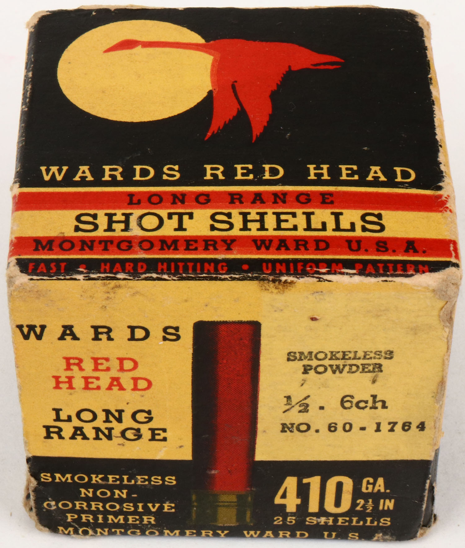 Montgomery Ward & Co., Red Head, 410ga., 1pc., Partial 19rds, shot size 6Ch, black background with red goose flying through the moon, box is solid with very nice colors, edge wear, shells are excellent. Grade: Excellent - Value: 20 to 50