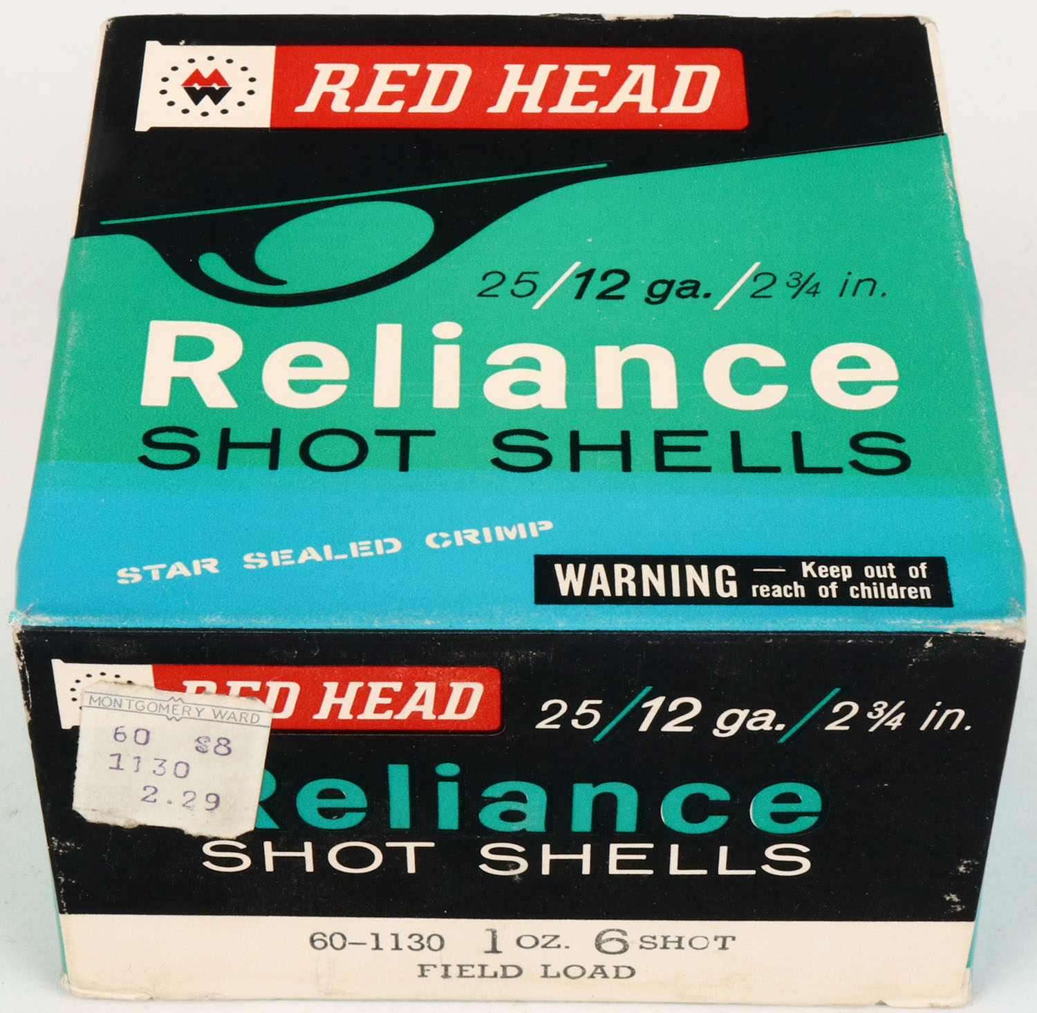 Montgomery Ward Red Head, 12ga., 1pc., Full, shot size 6, box is solid with very nice colors, shells are excellent. Grade: Excellent + - Value: 10 to 30