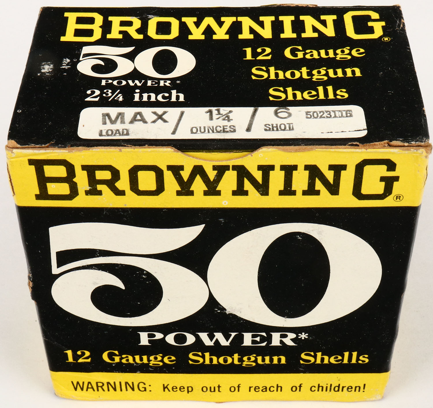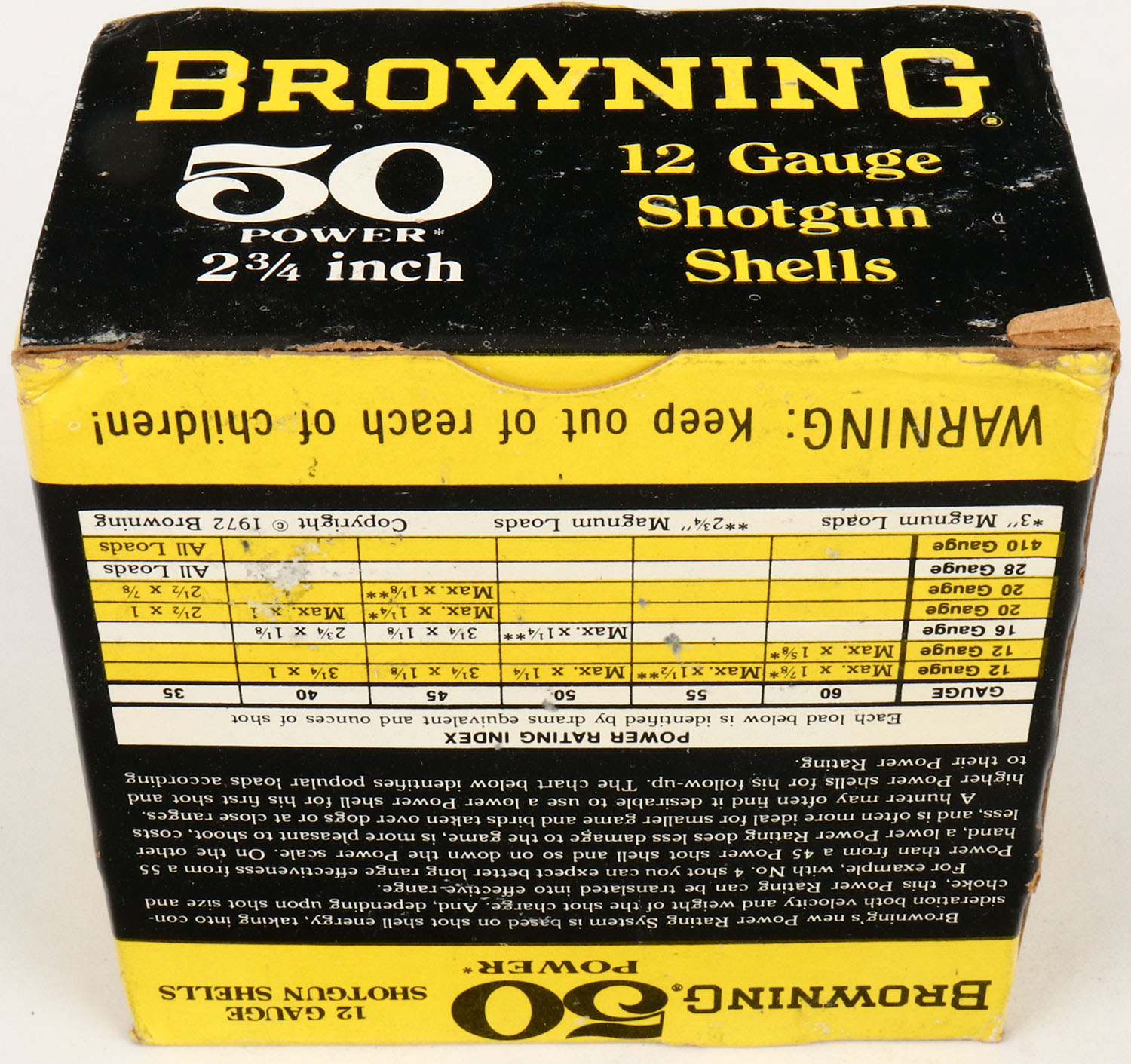 Browning, 50 Power, 12ga., 1pc., FULL, shot size 6, 2 3/4'', black, yellow & white box, box is solid with nice color, shells are excellent. Grade: Excellent ++ - Value: 20 to 60