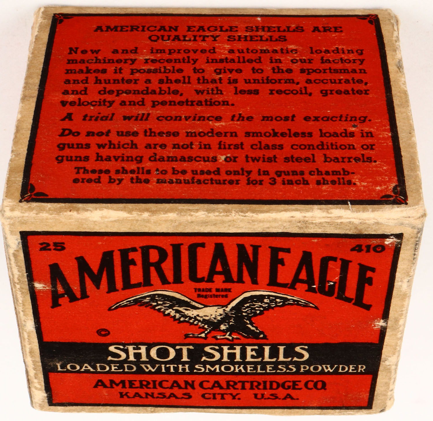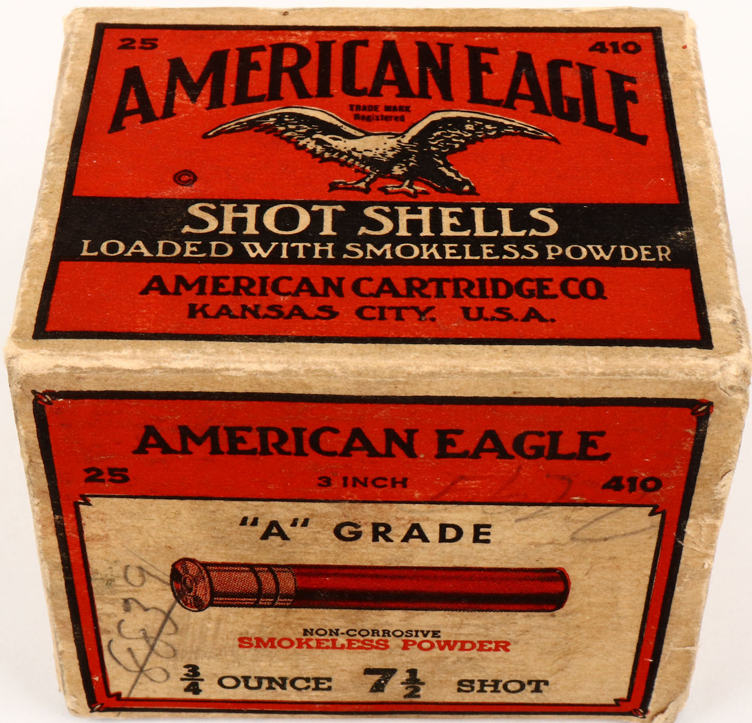 American Cart. Co., A-Grade, 410ga., 1pc., Full, shot size 7 1/2, buff, red & black box that pictures a flying eagle, box has light soiling, very nice colors, shells are very good. Grade: Excellent - Value: 50 to 250