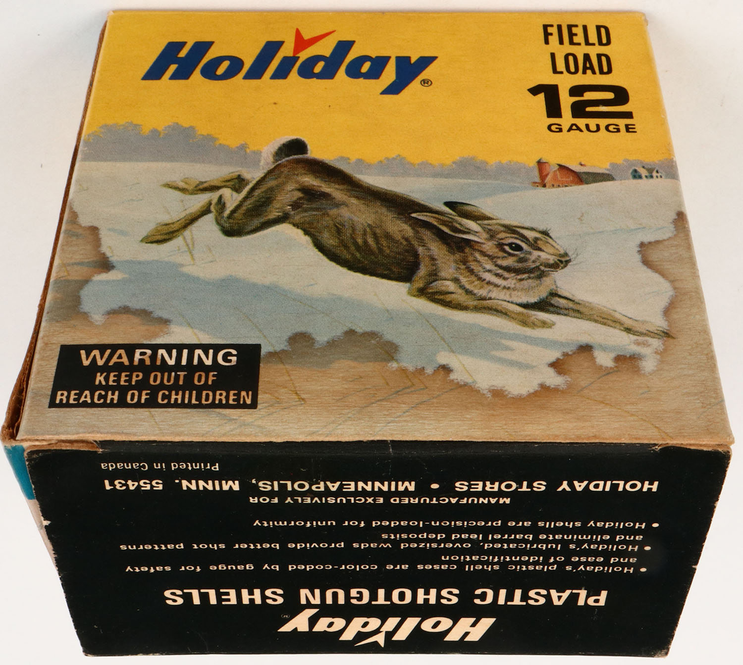 Holiday, Grouse/Rabbit Scene, 12ga., 1pc., Empty, 2 3/4'', shot size 8, multi color graphics of Grouse/Rabbit by Les Kouba, box is solid with soiling, very nice colors. Grade: Excellent - Value: 10 to 40