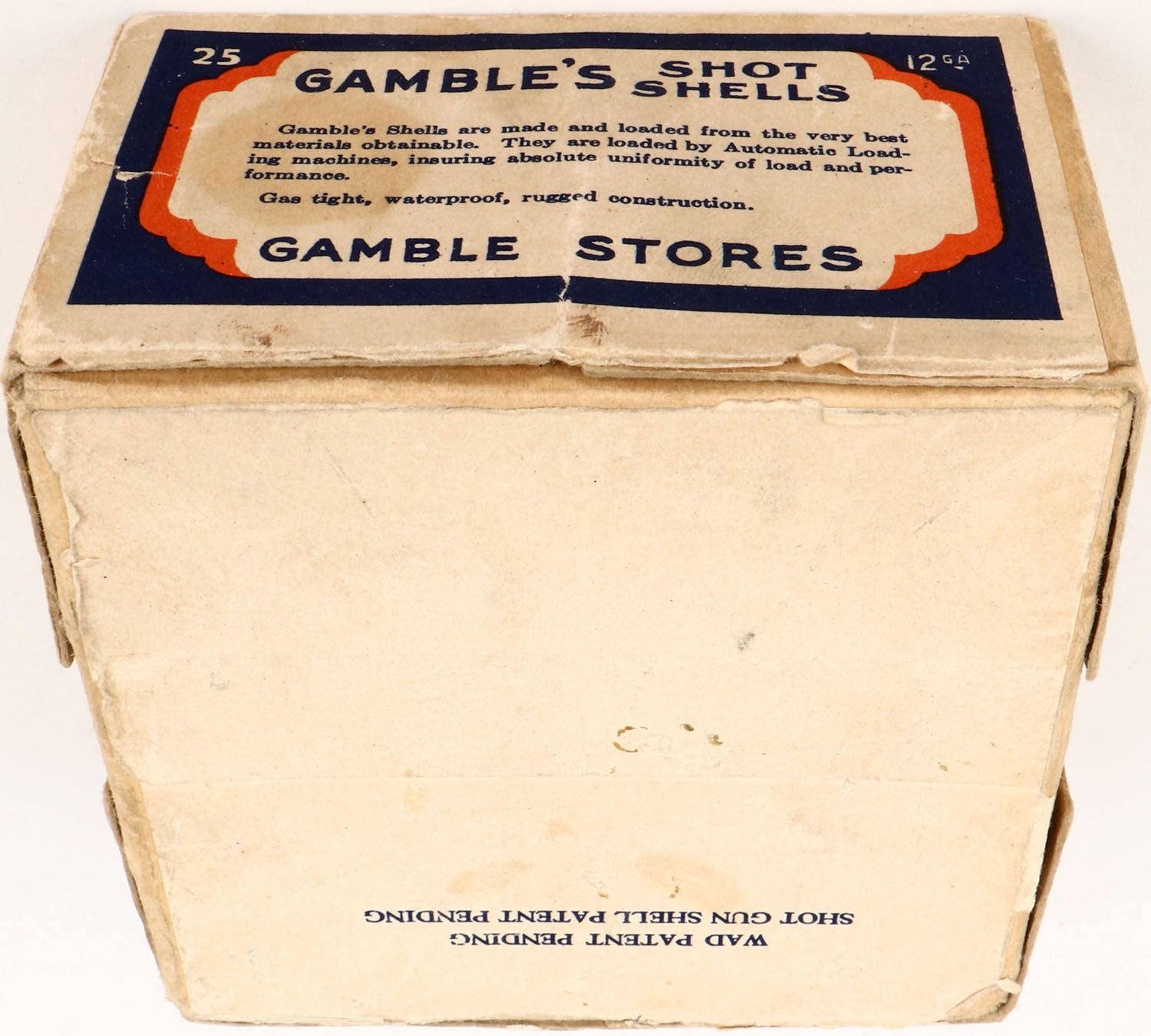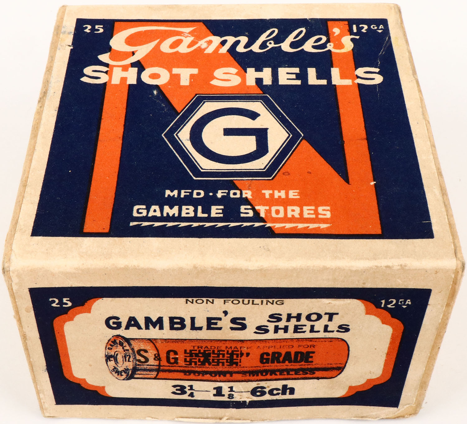 Gambles, S & G GRADE Shot Shells, 12ga., 2pc., Empty, shot size 6ch, buff box with blue, orange & white label, box has light soiling with excellent color to label has a stamp that blocks out XL. Grade: Excellent + - Value: 100 to 300