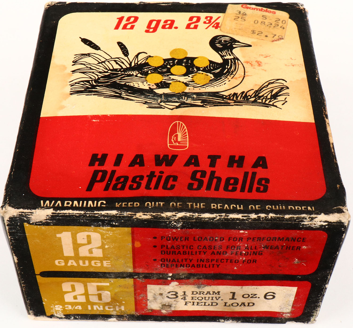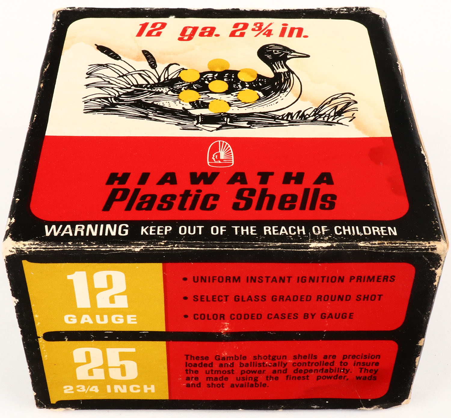 Gambles, Hiawatha, 12ga., 1pc., Full, shot size 6 Field Load, red, gold & black box, box is solid with age soiling, edge wear, nice colors, shells are very good. Grade: Very Good + - Value: 10 to 30