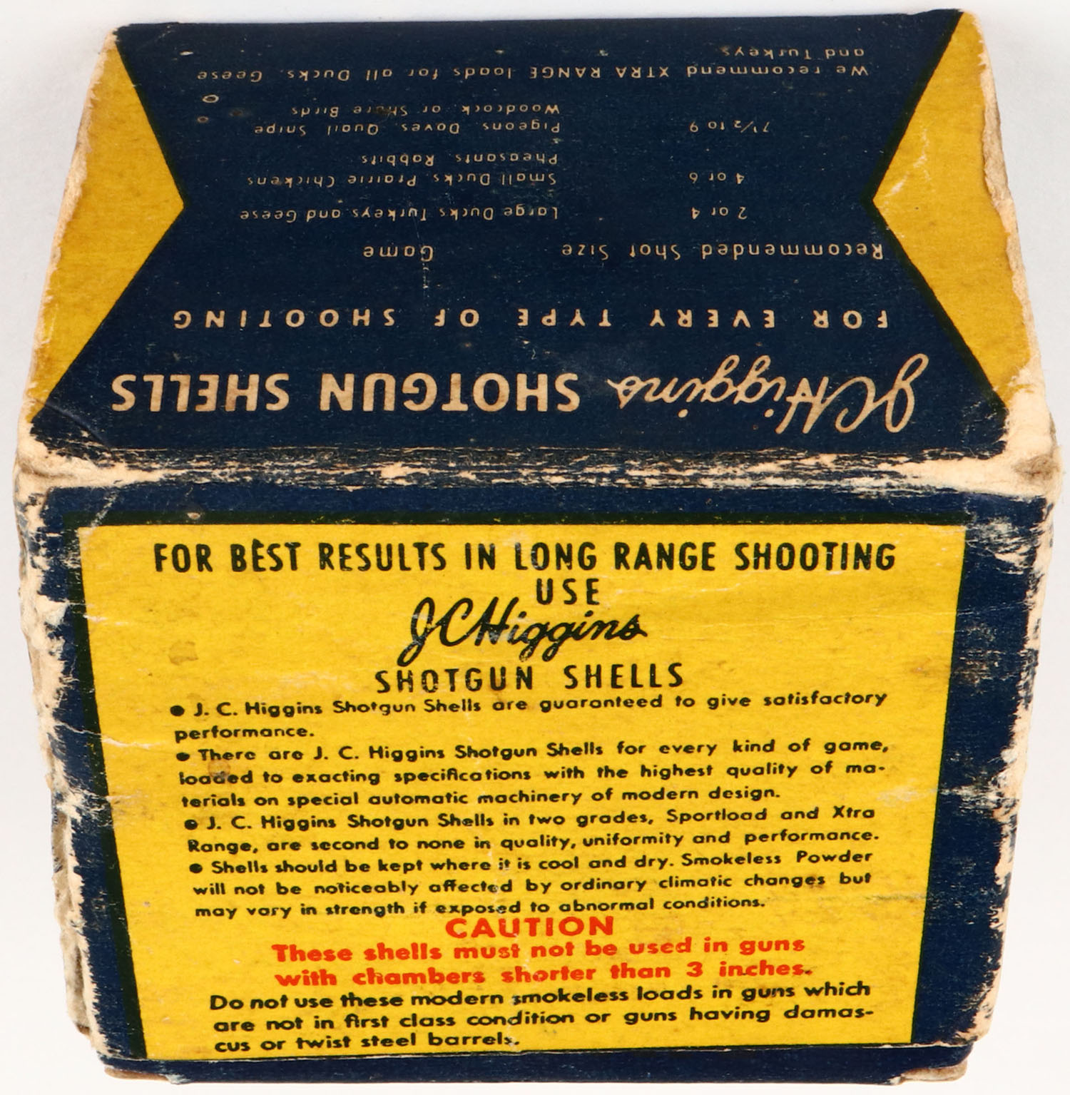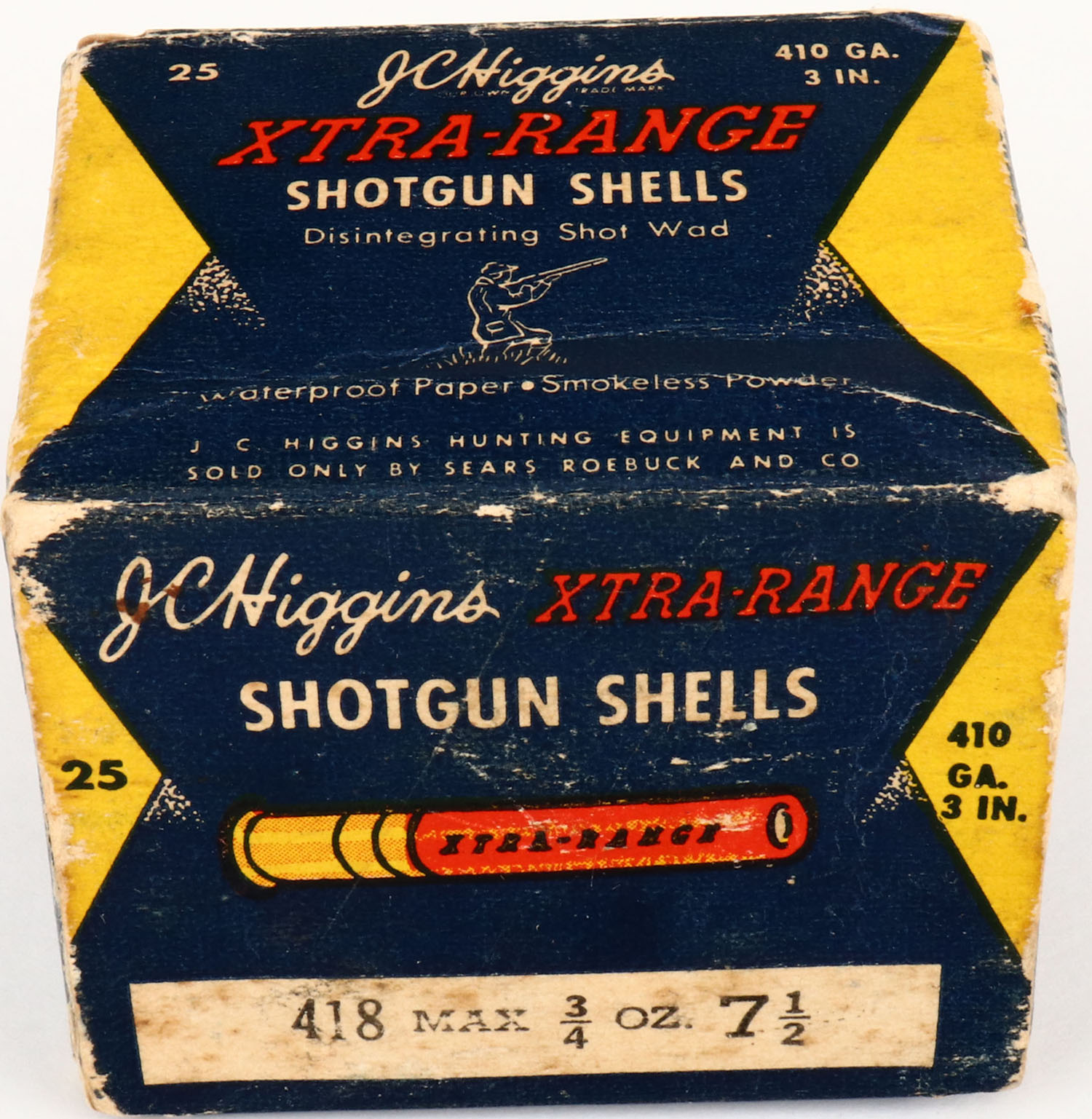 J.C. Higgins, Xtra-Range, 410ga., 1pc., Partial 22rds, shot size 7 1/2, blue, white & yellow box, box has seam split, edge wear, light age soiling & very nice colors, shells are excellent. Grade: Very Good + - Value: 10 to 40