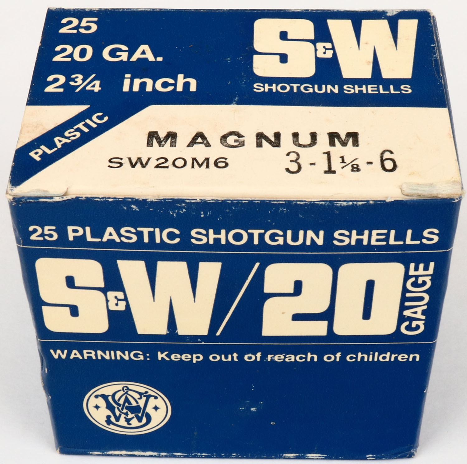 S&W, 20ga., 1pc., FULL, shot size 6 Magnum, box is solid, Shells are excellent. Grade: Excellent + - Value: 8 to 20