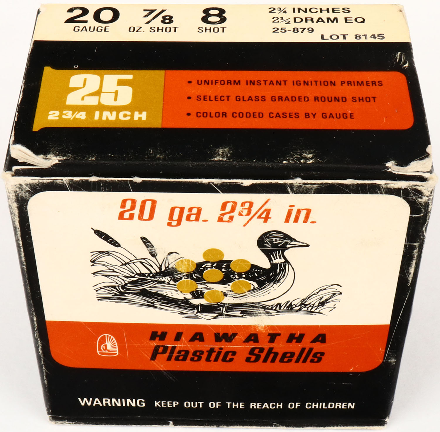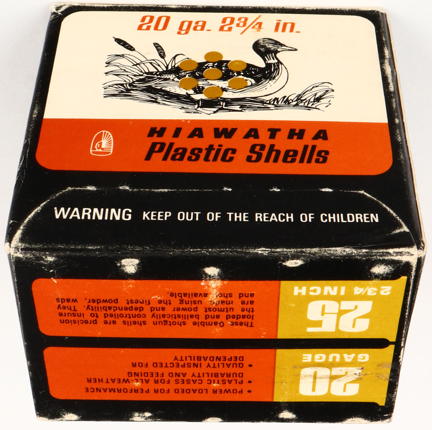 Gambles, Hiawatha, 20ga., 1pc., Full, shot size 8, orange, gold & black box, box is solid with light edge wear, very nice colors, shells are very good but have split ends. Grade: Excellent - Value: 8 to 20