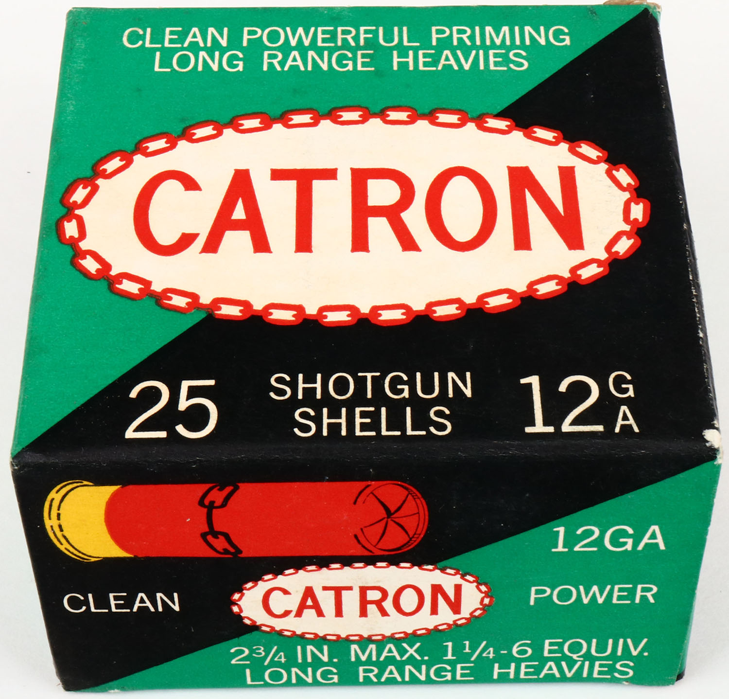 Catron, 12ga., 1pc., FULL, shot size 6, box is solid, Shells are excellent. Grade: Excellent + - Value: 8 to 20