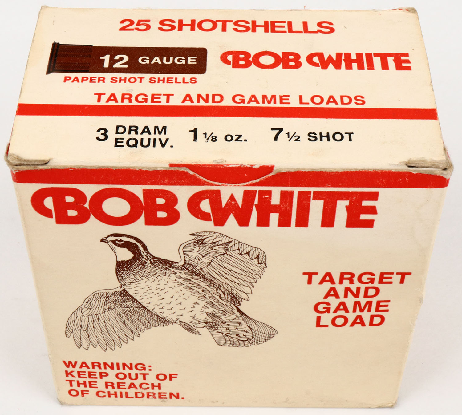 Bob White Target Company, 12ga., 1pc., FULL, shot size 7 1/2, box is solid, Shells are excellent. Grade: Excellent + - Value: 8 to 20