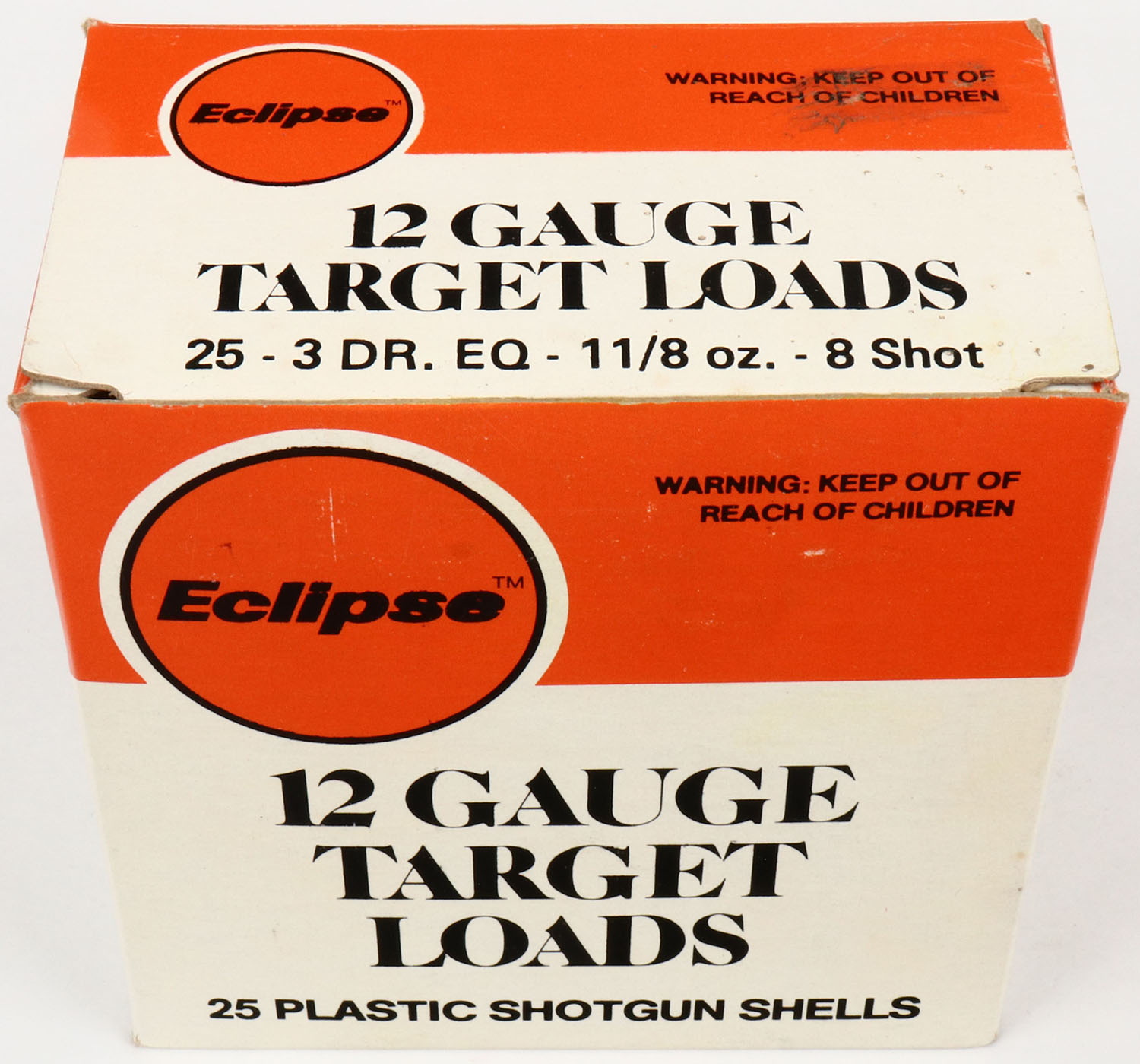 Eclipse, 12ga., 1pc., FULL, shot size 8 Target Loads, box is solid, Shells are excellent. Grade: Excellent + - Value: 8 to 20