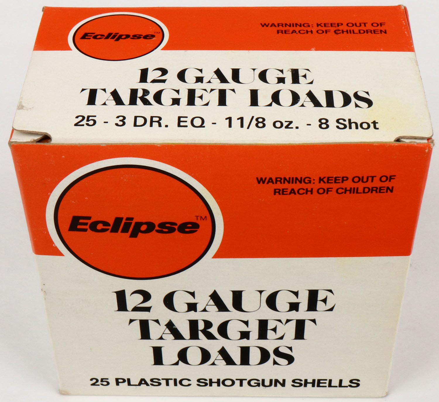 Eclipse, 12ga., 1pc., FULL, shot size 8 Target Loads, box is solid, Shells are excellent. Grade: Excellent + - Value: 8 to 20