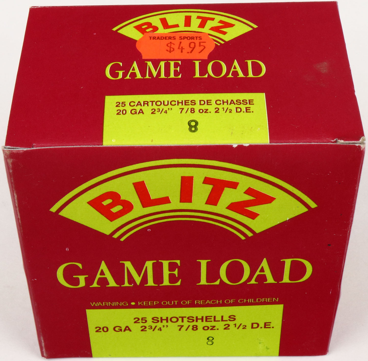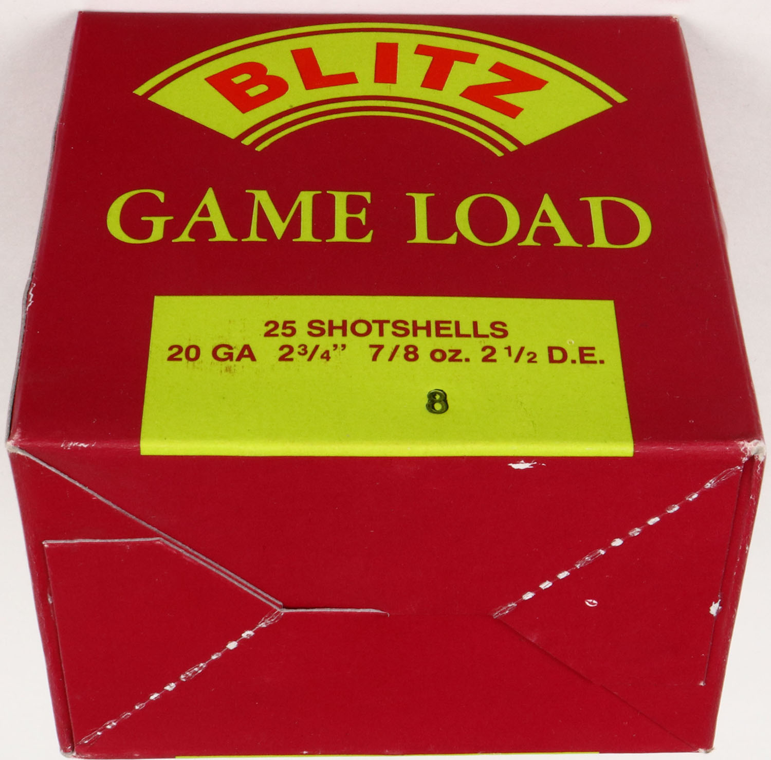 Blitz, 20ga., 1pc., FULL, shot size 8 Game Load, box is solid, Shells are excellent. Grade: Excellent + - Value: 8 to 20