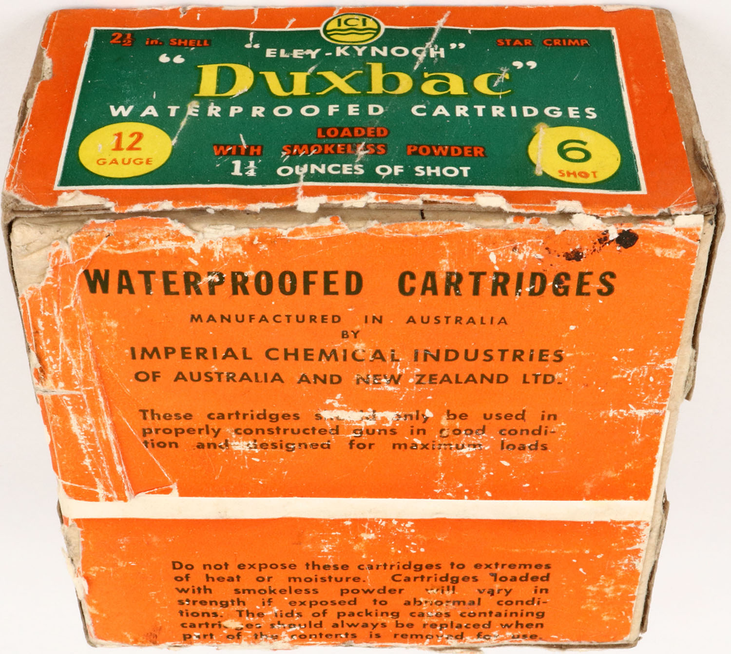 Duxbac, 12ga., 2pc., FULL, shot size 6, box is solid, Shells are very good. Grade: Excellent - Value: 8 to 30