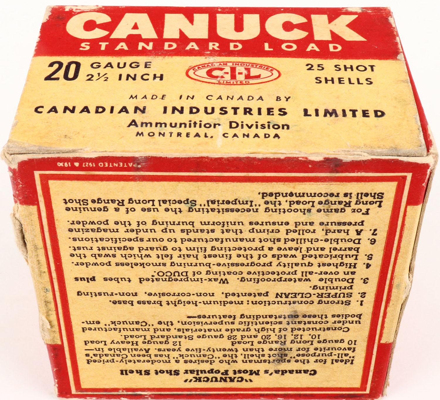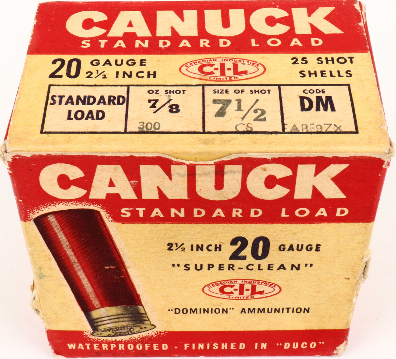 Canuck, 20ga., 1pc., Partial 24rds, shot size 7 1/2, box is solid, Shells are excellent. Grade: Excellent + - Value: 8 to 20