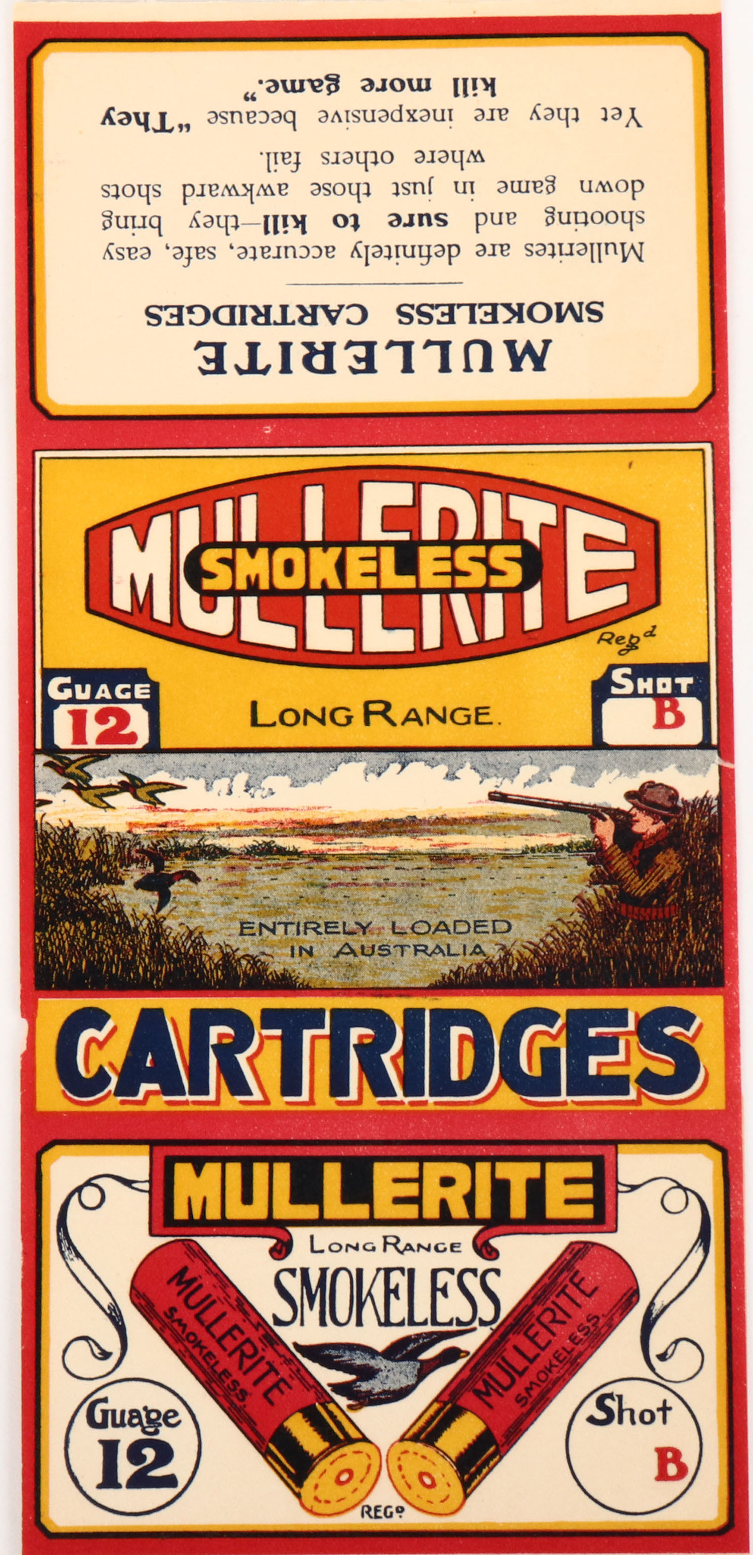 Mullerite, 12ga., 2pc. Label, shot size B, Label is Minty. Grade: Excellent ++ - Value: 10 to 50
