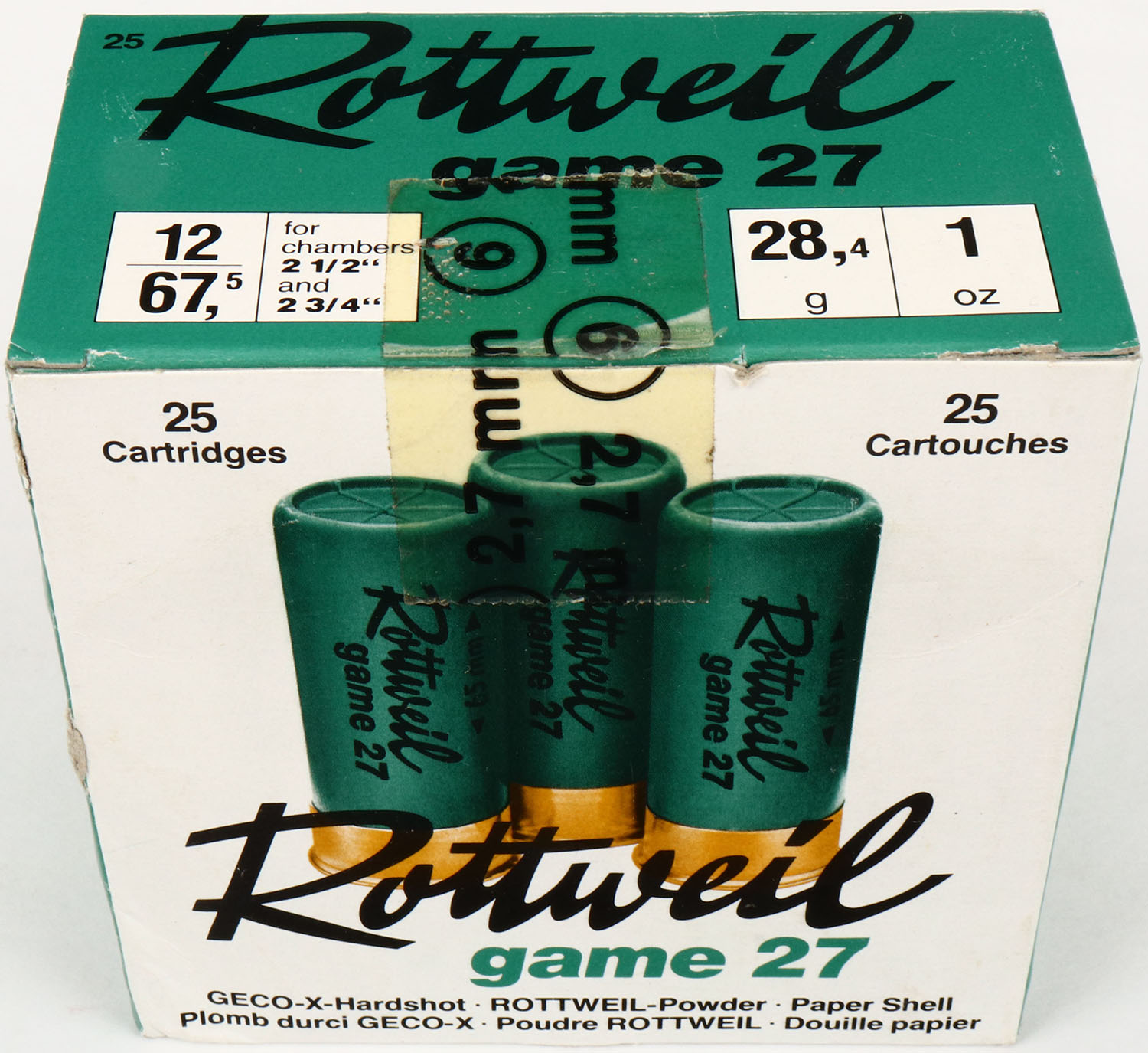 Rottweil, Game 27, 12ga., 1pc., FULL, shot size 6, box is solid, Shells are excellent. Grade: Excellent + - Value: 8 to 20