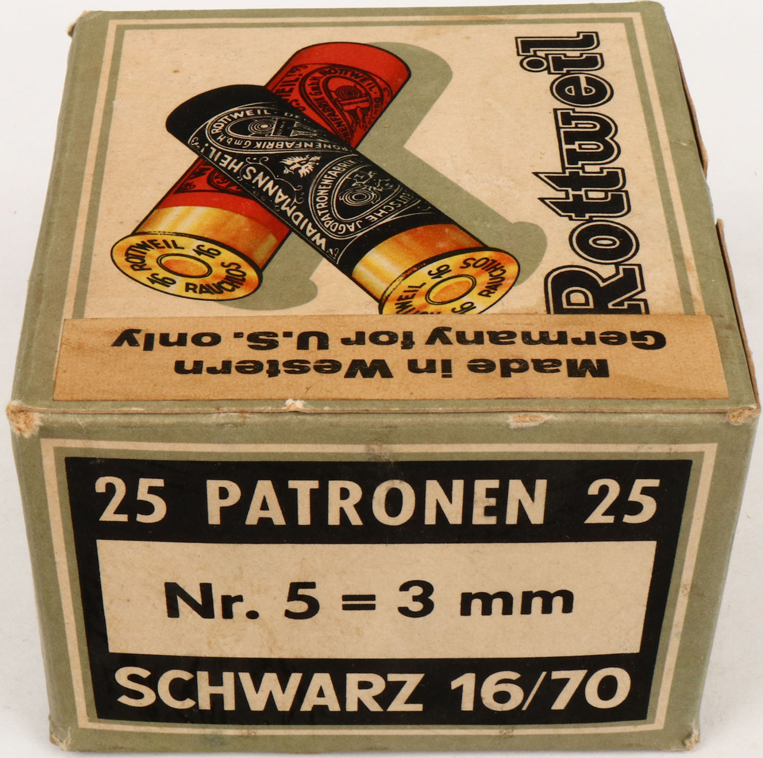 Rottweil, with insert, 16ga., 1pc., Partial 20rds, shot size 5 Magnum Load, box is solid, Shells are excellent. Grade: Excellent + - Value: 8 to 20