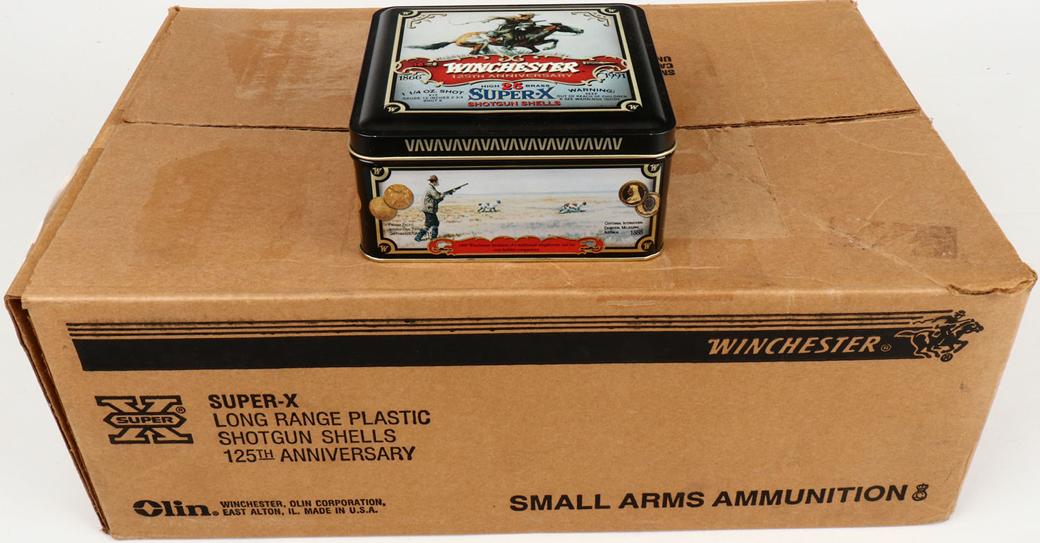 Winchester, Super-X 125th ANNIVERSARY, Case of 12 Tins in original Case, 300rds, 1866-1991, 12ga., 1pc., FULL, shot size 6, box is solid, Shells are excellent. Grade: MINT - Value: 400 to 1000