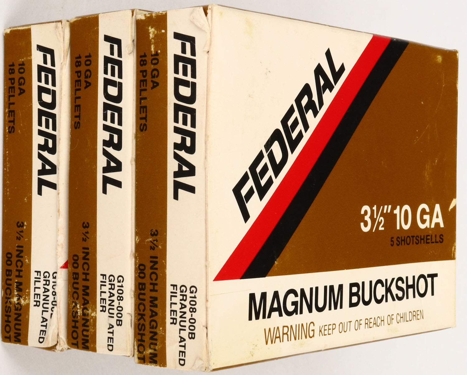 Lot of 2 Federal, 10ga., 1pc., FULL, shot size Magnum Buckshot, boxes are solid, Shells are excellent. Grade: Excellent + - Value: 6 to 16