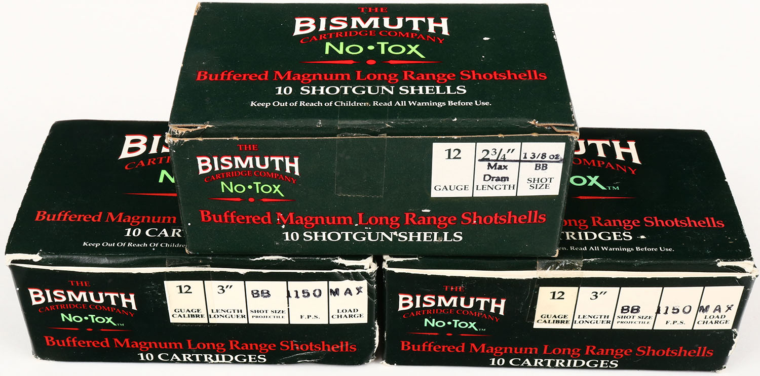 Lot of 2 Bismuth, 12ga., 1pc., FULL, shot size BB, boxes are solid, Shells are excellent. Grade: Excellent + - Value: 8 to 20