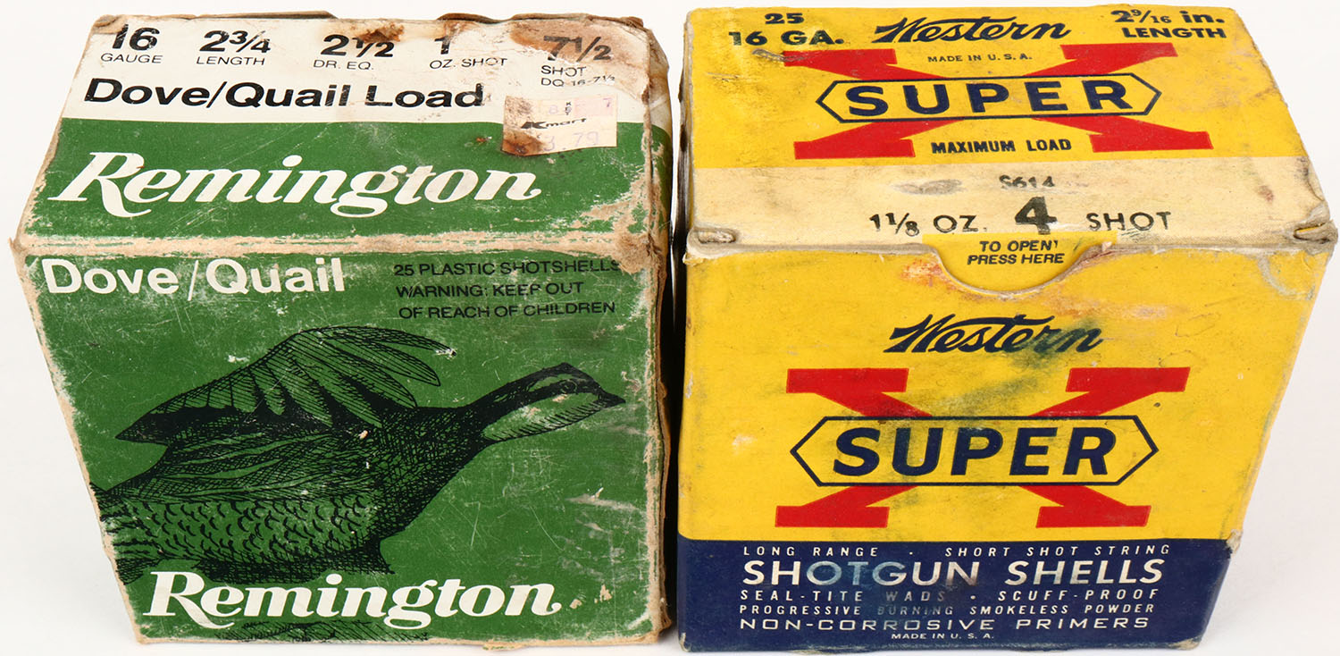 Lot of 2 Western/Remington, 16ga., 1pc., Mostly Full, shot size 7 1/2 & 4, boxes are solid, Shells are good. Grade: Very Good + - Value: 8 to 20
