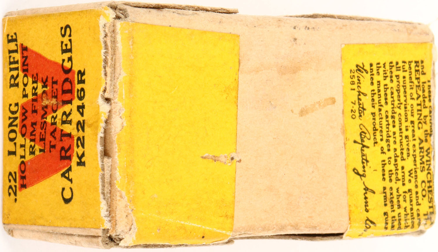 Winchester, .22 Long Rifle Hollow Point, Lesmok Cartridges, RR: WRA-181 LR-67b, Full, 2pc, Buff box with green & yellow wraparound label, box is solid with excellent to minty color, only very minor age soiling & corner wear, very minor edge wear, ammo is very good. Grade: Excellent ++ - Value: 20 to 80