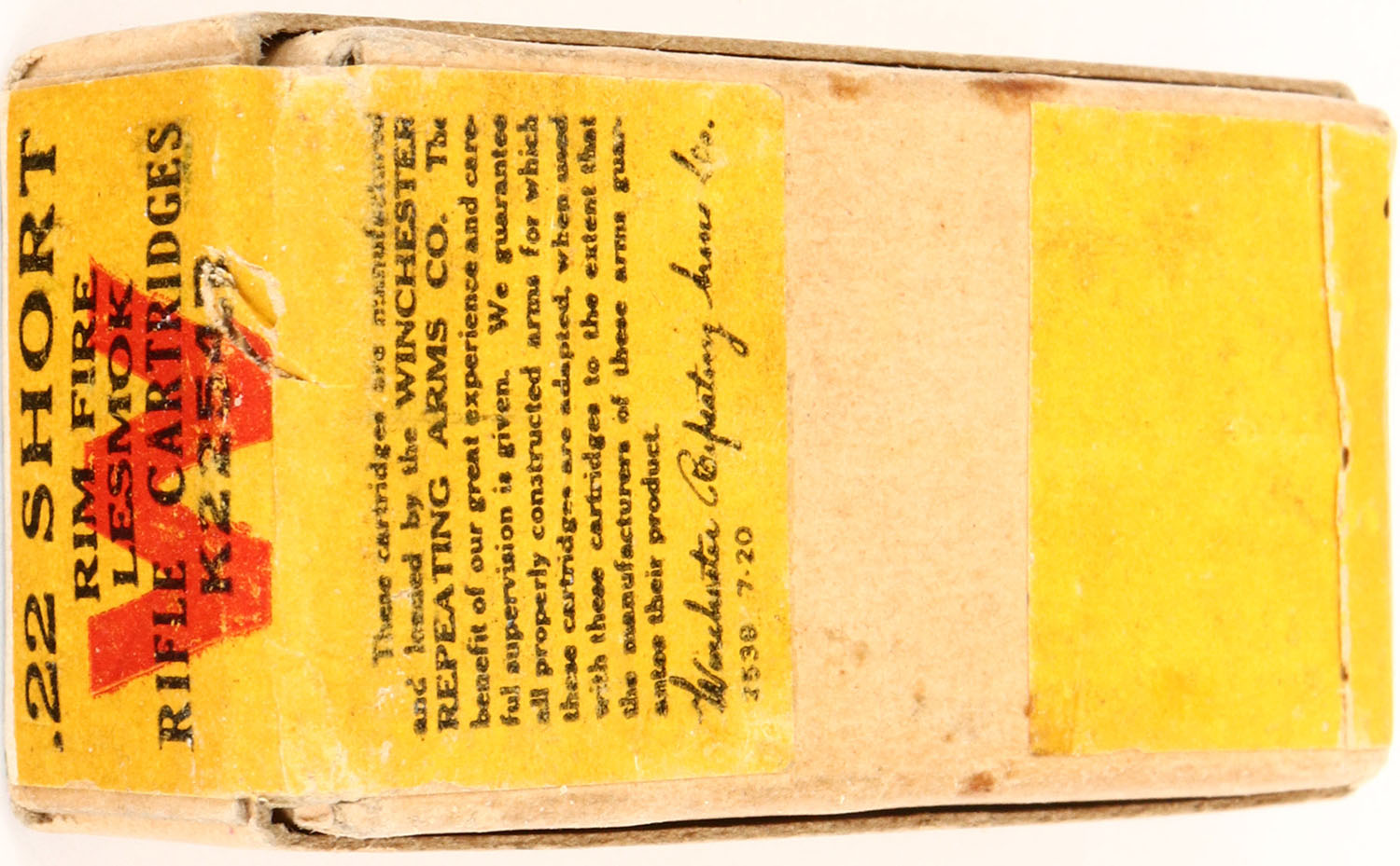 Winchester, .22 Short, Lesmok, RR: WRA-178 S-65c, FULL & SEALED, 2pc. Buff box with green & yellow wraparound label, box is solid with excellent color, small stain on front side, very minor age soiling, very minor edge & corner wear, labels are intact. Grade: Excellent ++ - Value: 30 to 120