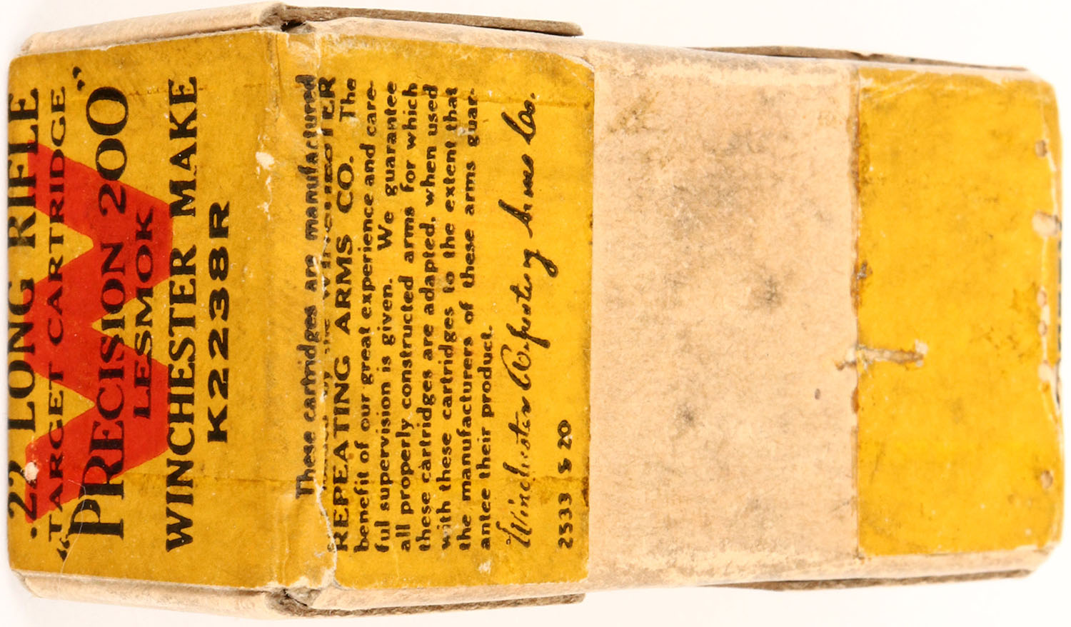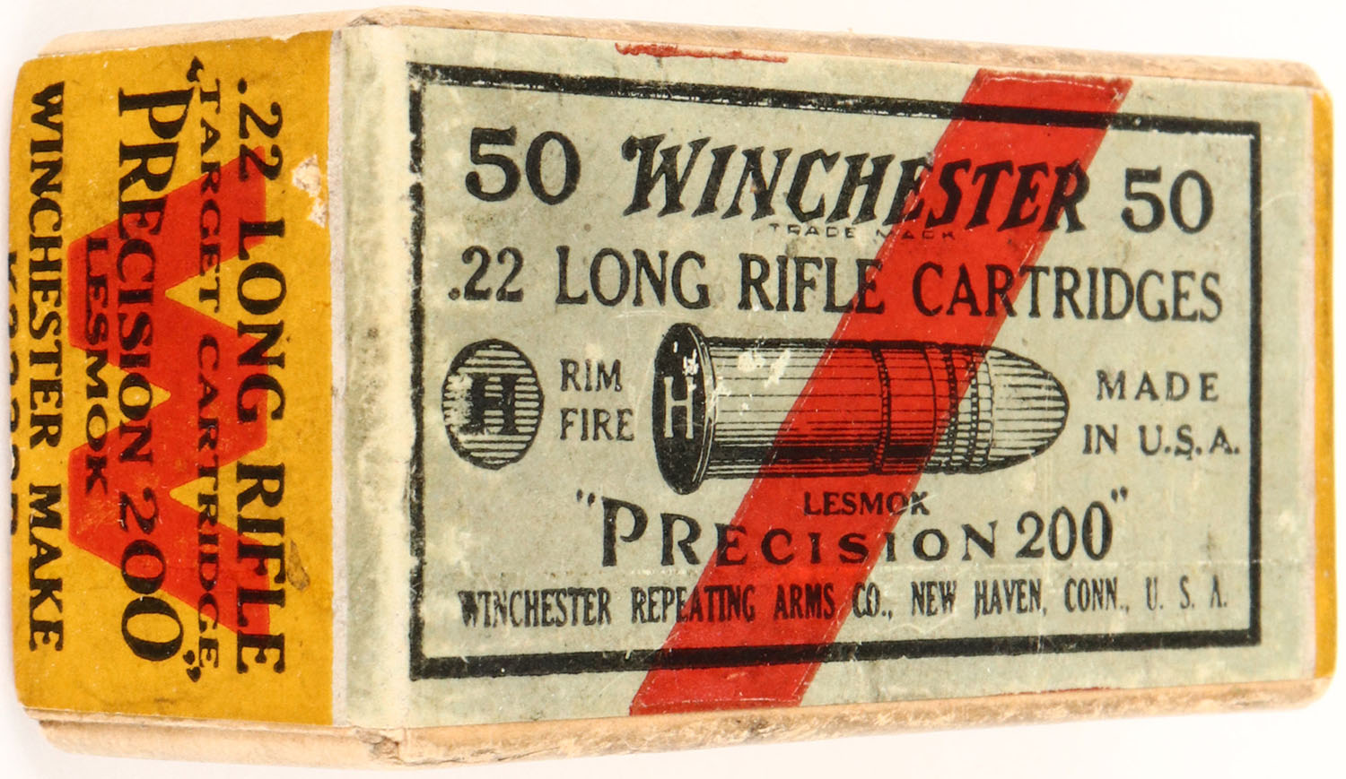 Winchester, ''Precision 200'', .22 Long Rifle Cartridges, FULL & SEALED, 1923 issue, RR: WRA-130 LR-43b, buff box with gray & yellow wraparound label and horizontal red stripe, box is solid with very good color, minor age soiling, minor edge wear, edges are crisp. Grade: Excellent + - Value: 100 to 300