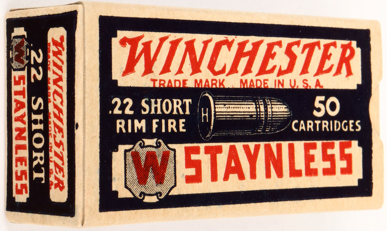 Winchester, Staynless, .22 Short, RHWeb: WRA-12B S-1b, Full, 1pc. Blue white & red box, box is near mint with minty color, only very minor age soiling, corners are sharp, edges are crisp, end flaps are solid, ammo is good. Grade: Excellent ++ - Value: 30 to 90