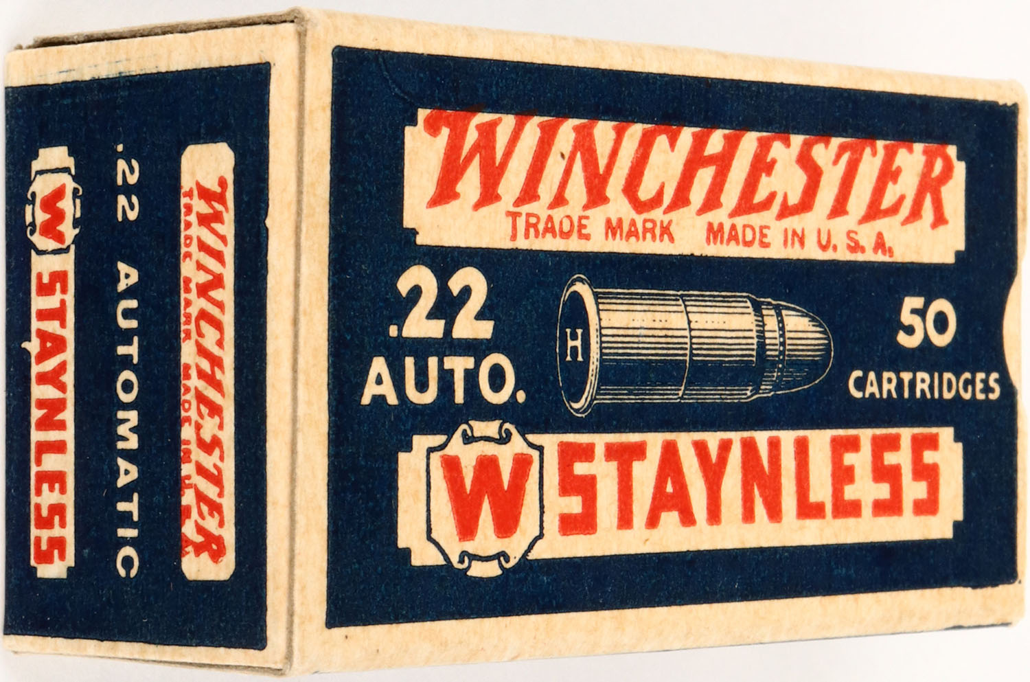 Winchester, Staynless, .22 Automatic, RHWeb: WRA-12B WA-1Bd (unshaded shield), Full, 1pc. Blue white & red box, box is near mint with excellent color, only very minor age soiling, corners are mostly sharp, edges are crisp, end flaps are solid, ammo is minty. Grade: Excellent ++ - Value: 40 to 120
