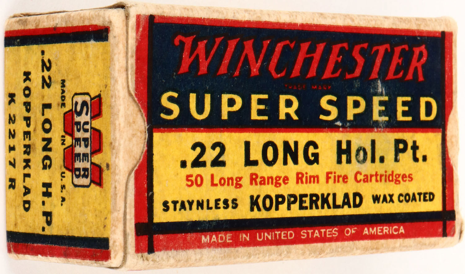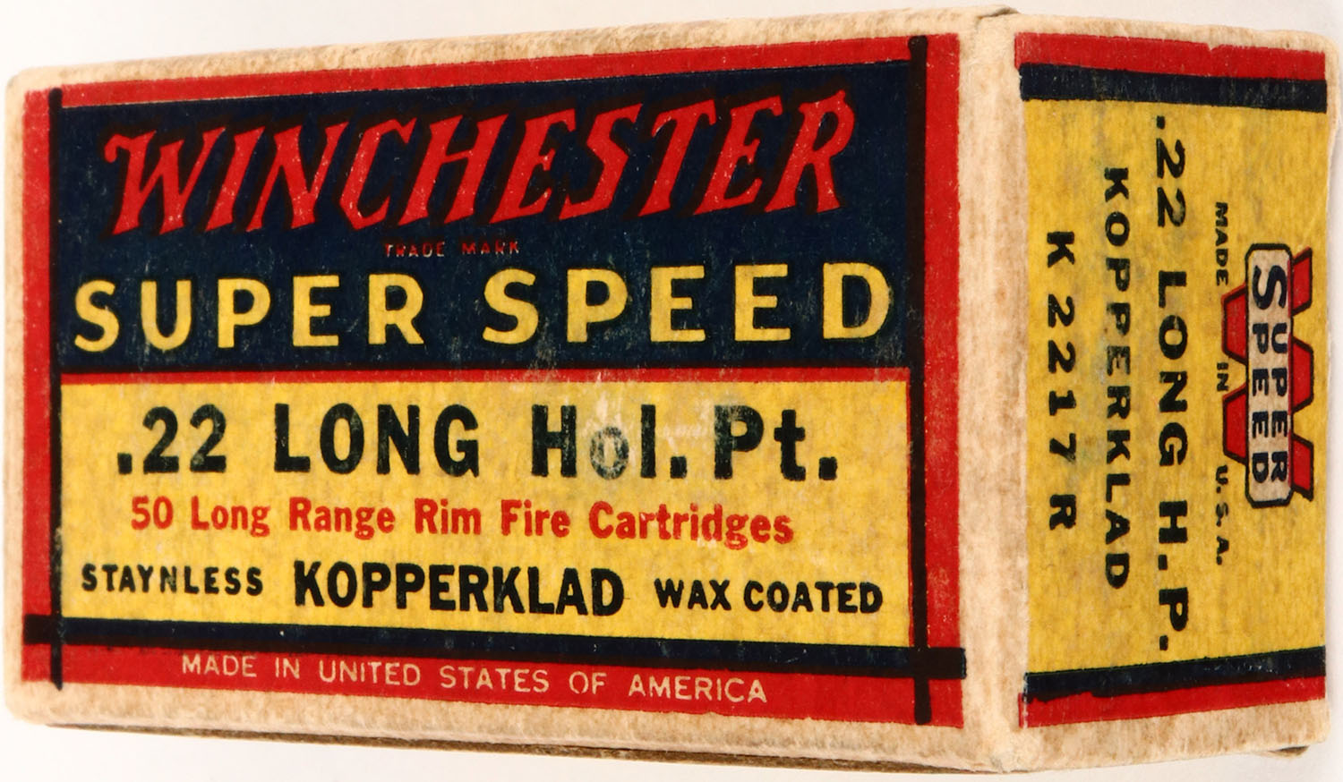 Winchester, Super Speed, .22 Long Hollow Point, Staynless KopperKlad Wax Coated, RHWeb: WRA-14B L-3, Full, 1pc. Yellow blue & red box, box is solid with excellent color, minor age soiling, very minor edge & corner wear, end flaps are rigid, ammo is excellent. Grade: Excellent - Value: 10 to 50