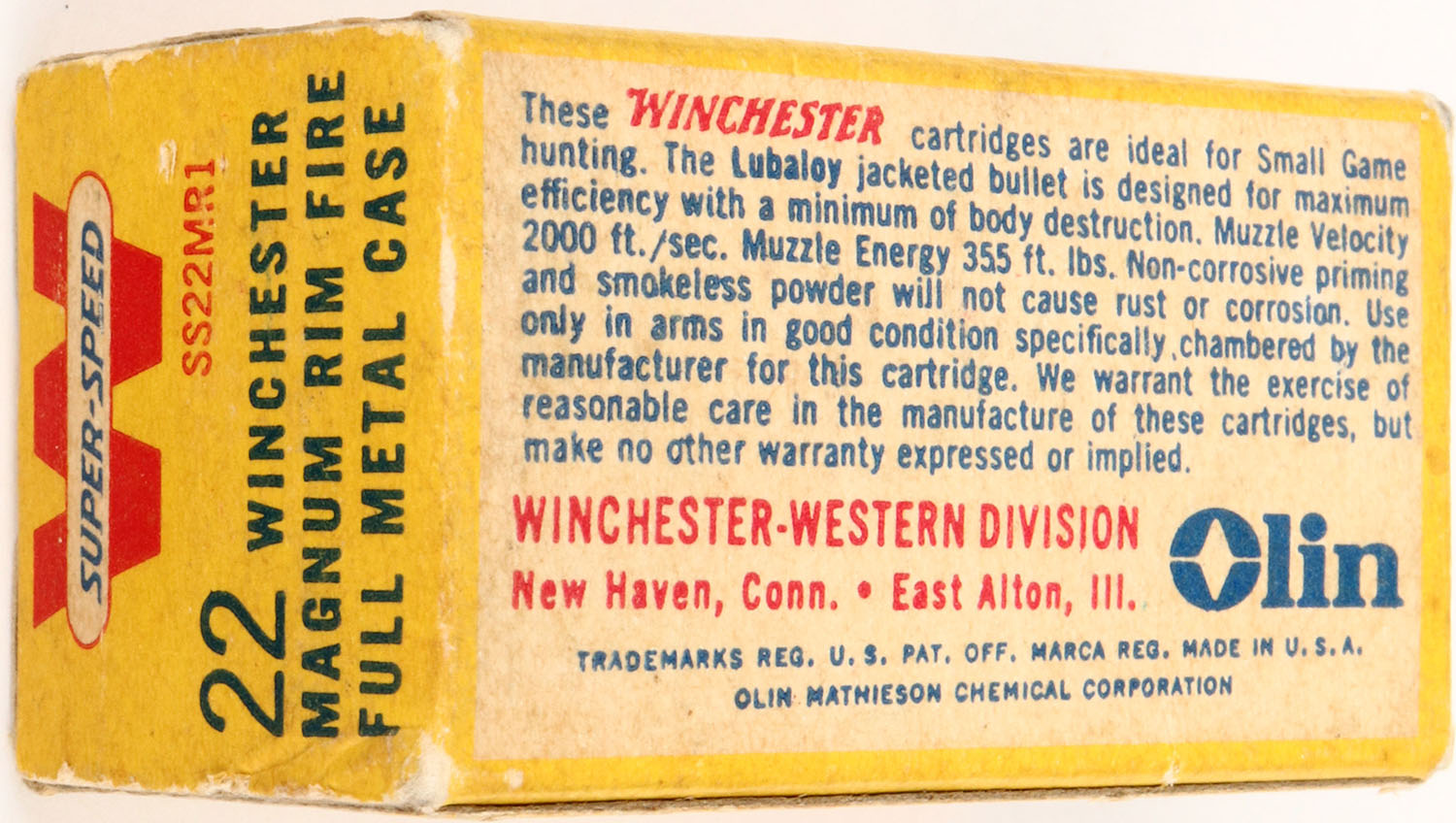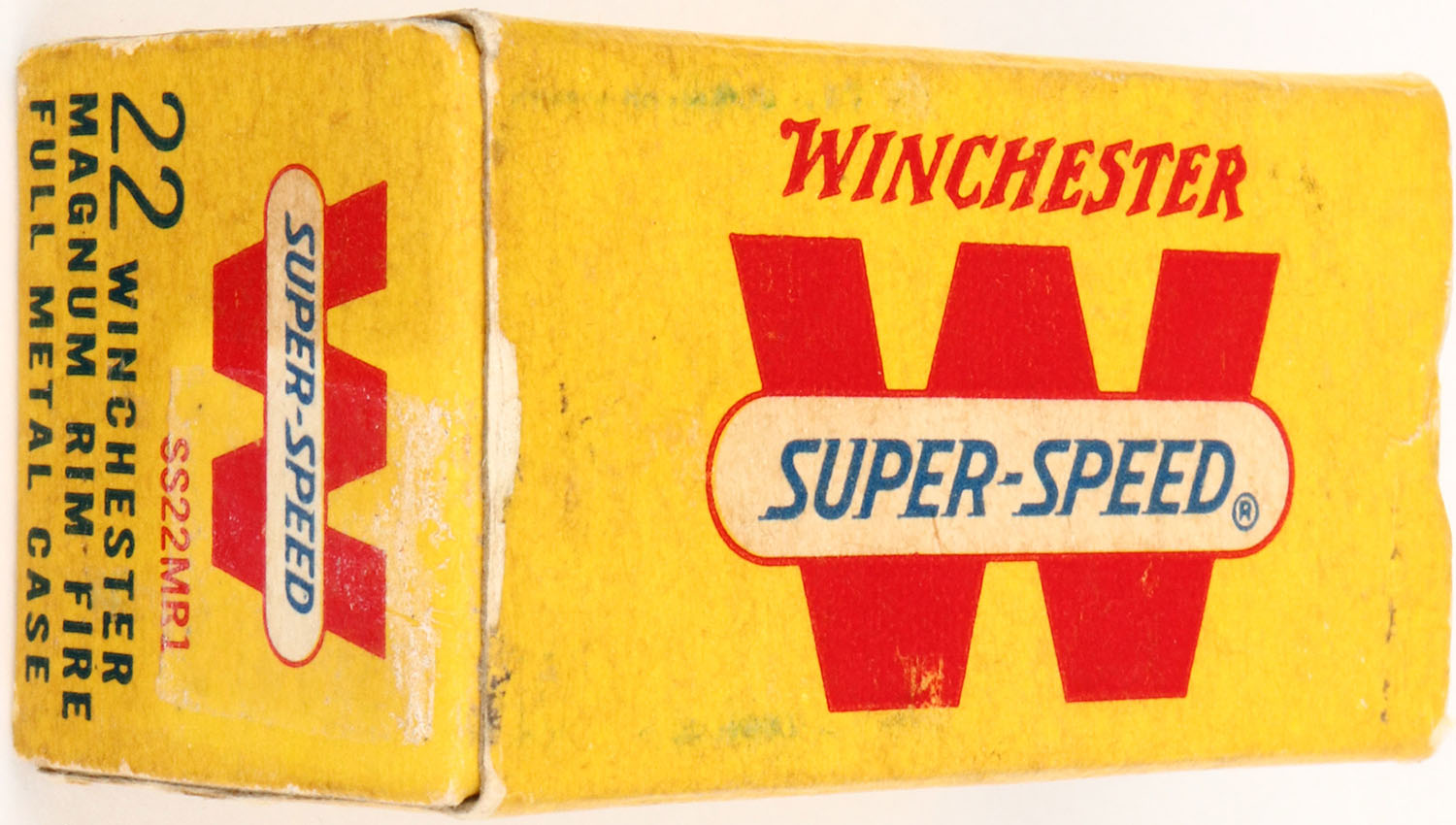 Winchester, Super-Speed, .22 W.M.R., 40 Grs. Full Metal Case, RHWeb: WRA-19 WMR-1, Full, 1pc. Yellow white & red box, box is solid with excellent color, very minor age soiling, very minor corner wear, edges are mostly crisp, end flaps are rigid, ammo is very good to excellent. Grade: Excellent + - Value: 10 to 50