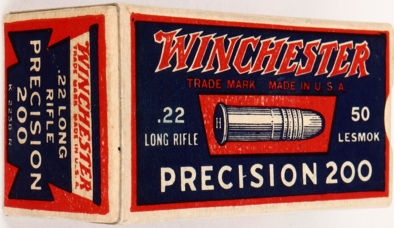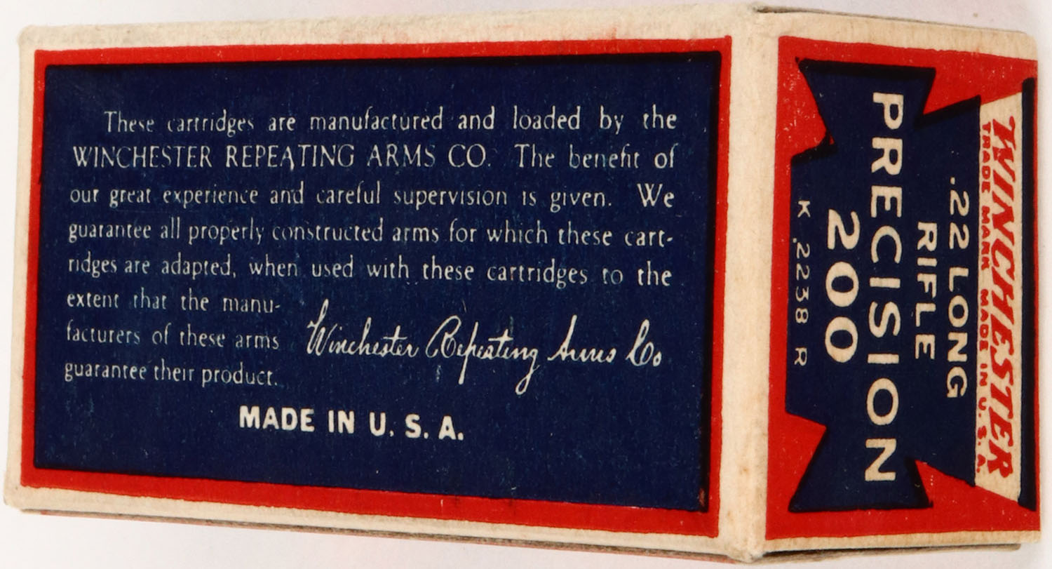 Winchester, Precision 200, .22 Long Rifle, Target Cartridges, RHWeb: WRA-53 LR-11c, Full, 1pc. Blue red & white box, box is near mint with only very minor shelf wear, corners are sharp, edges are crisp, end flaps are rigid, ammo is excellent. Grade: Mint - Value: 50 to 150