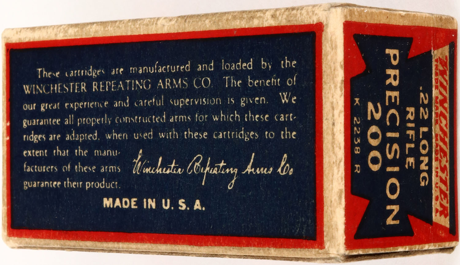 Winchester, Precision 200, .22 Long Rifle, Lesmok, RHWeb: WRA-53 LR-11d, Full, 1pc. Blue red & white box, box is solid with excellent colors, age soiling to white edges, ammo is excellent. Grade: Excellent - Value: 30 to 120