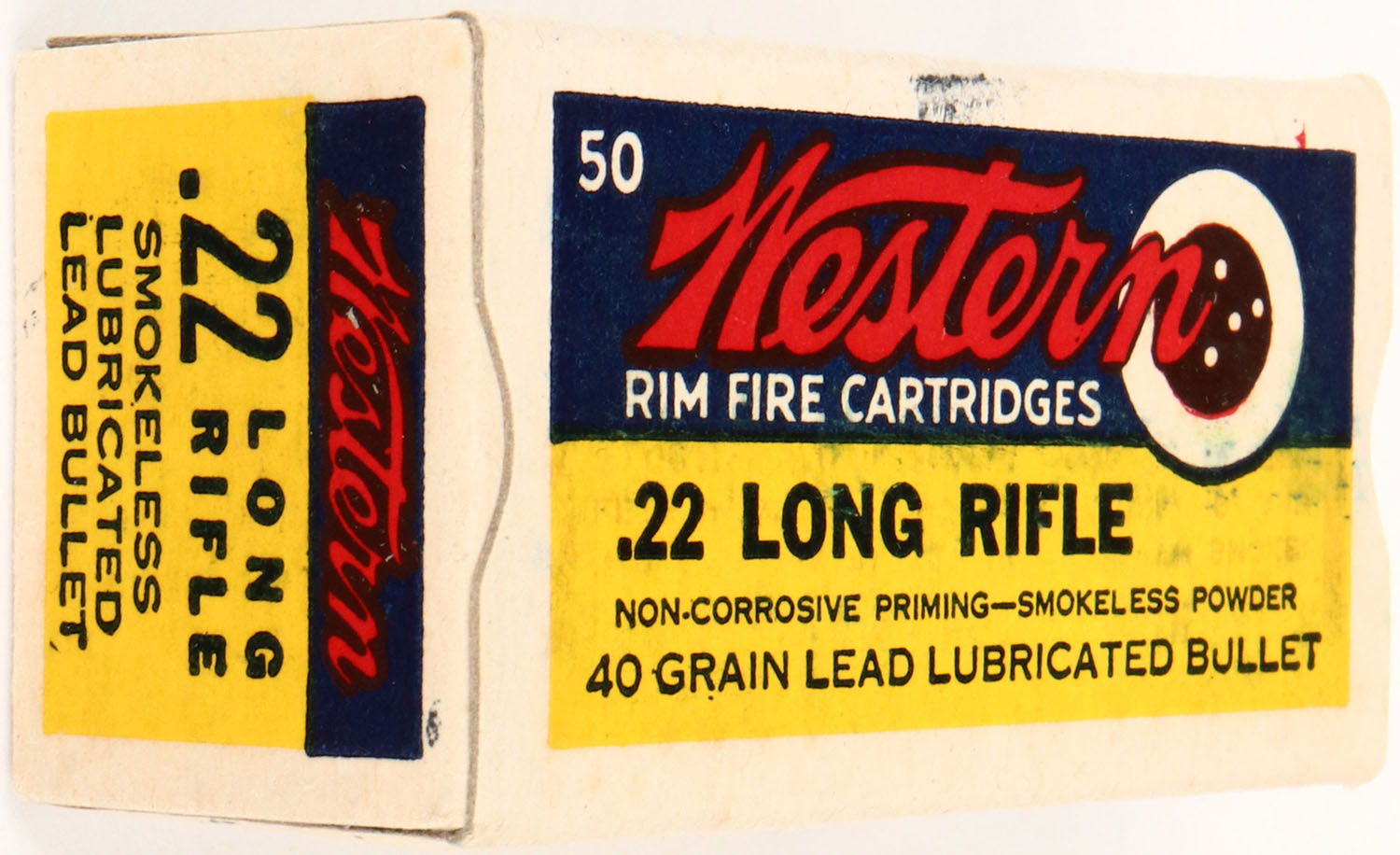 Western, .22 Long Rifle, Army Lot 6059 1945, Non-Corrosive - Smokeless, RHWeb: WCC-4.3B LR-1h, Full, 1pc. Yellow blue & red bullseye box, box is solid with excellent color, some shelf wear, corners are sharp, edges are crisp, end flaps are solid, ammo is excellent. Grade: Excellent ++ - Value: 10 to 50