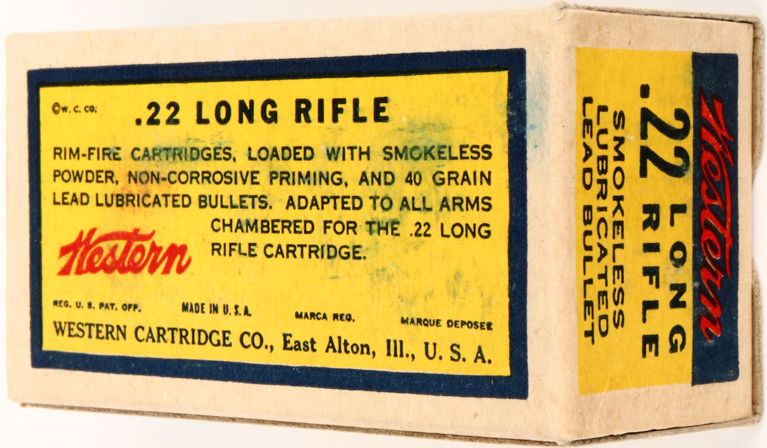 Western, .22 Long Rifle, Smokeless, RHWeb: WCC-4.3B LR-1a, Full, 1pc. Yellow blue & red box, box is solid with excellent to minty color, minor shelf wear, corners are sharp, edges are crisp, end flaps are solid, ammo is excellent. Grade: Excellent ++ - Value: 10 to 50