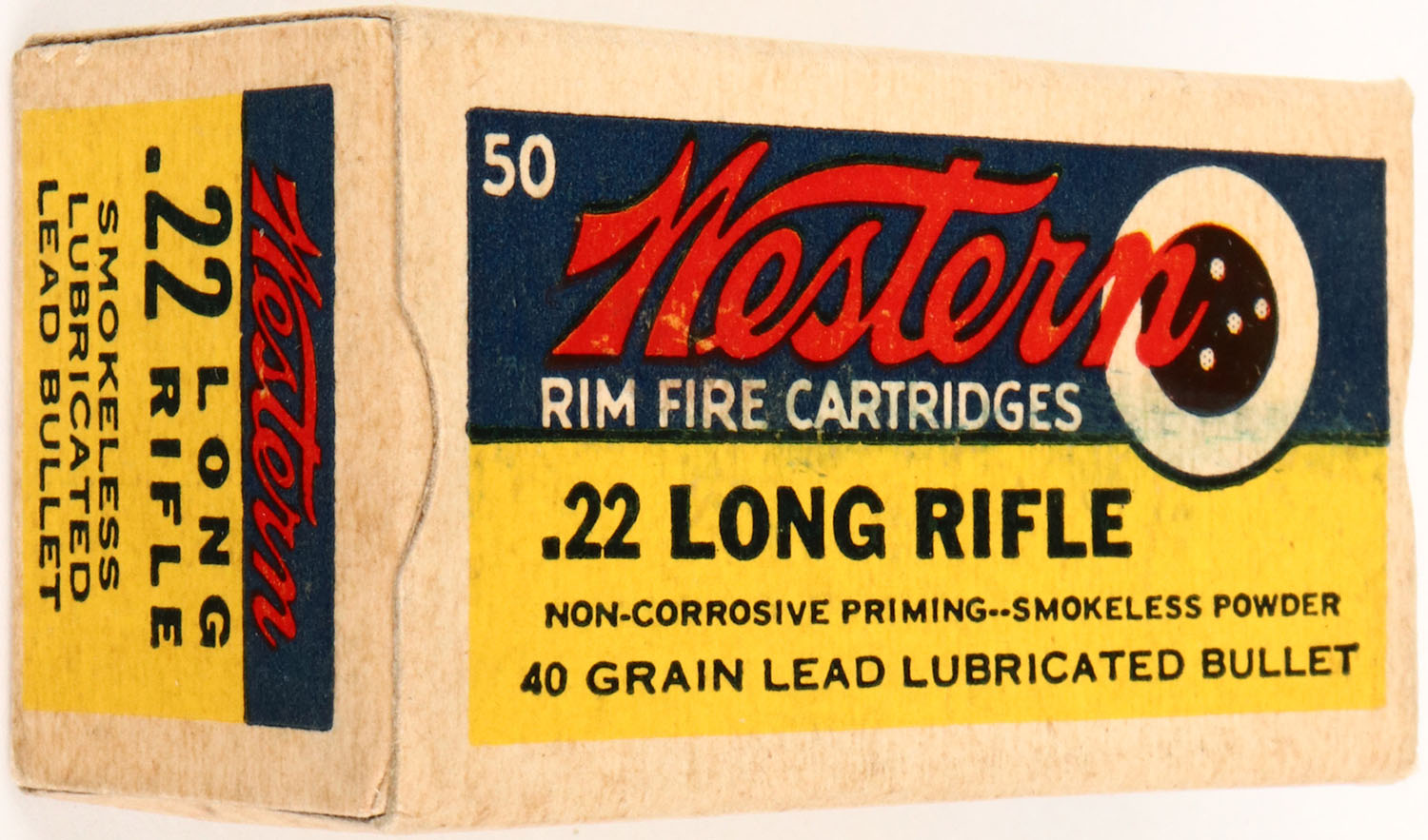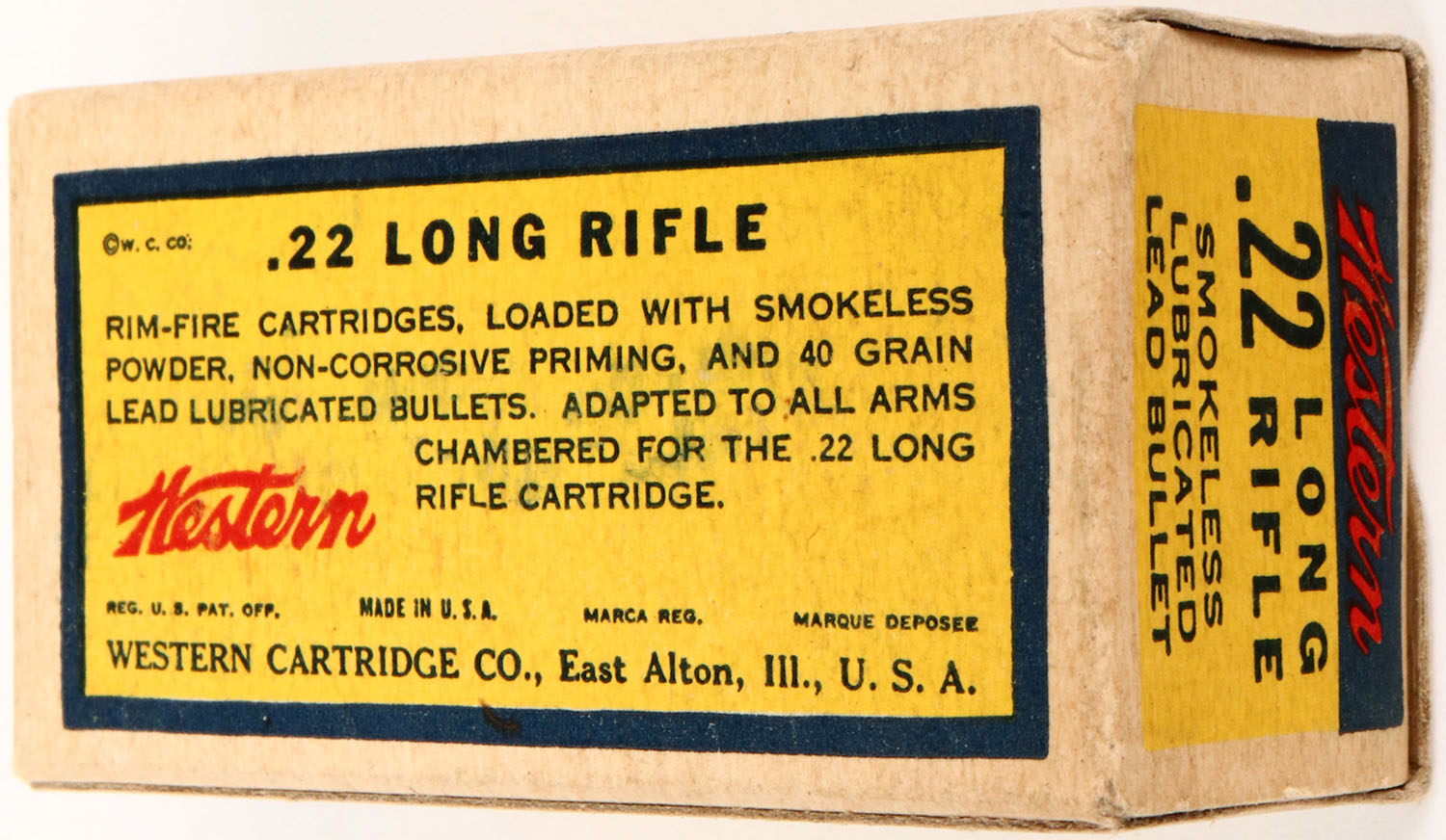 Western, .22 Long Rifle, RHWeb: WCC-4.3B LR-1a, Army Lot 304 1940, Full, 1pc. Yellow blue & red box, box is solid with excellent color, very minor age soiling, corners are sharp, edges are crisp, end flaps are rigid, ammo is excellent. Grade: Excellent ++ - Value: 10 to 50