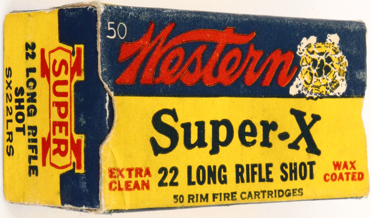 Western Cart. Co., Super - X, CLAY TARGET, .22 Long Rifle SHOT, 1pc., Full, RHWeb: WCC-8 LR-4b, yellow, blue & red box with picture of Broken Clay Target, box is solid with nice colors, ammo is excellent. Grade: Excellent - Value: 8 to 40