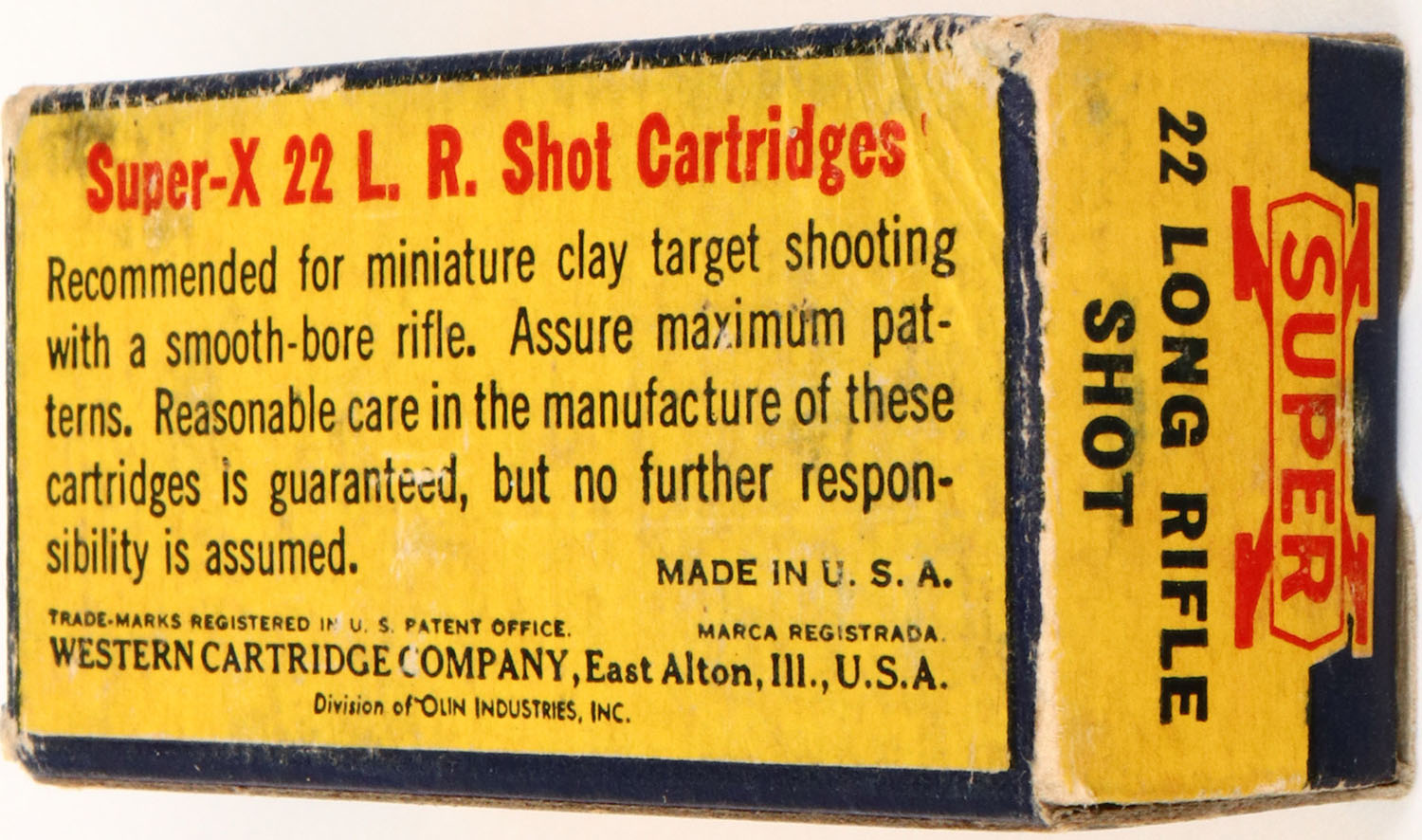 Western, Super-X, .22 Long Rifle Shot, Extra Clean Wax Coated, RHWeb: WCC-47 LRS-16, Full, 1pc. Yellow blue & red box, box is solid with excellent color, some edge wear, ammo is excellent. Grade: Excellent ++ - Value: 8 to 40