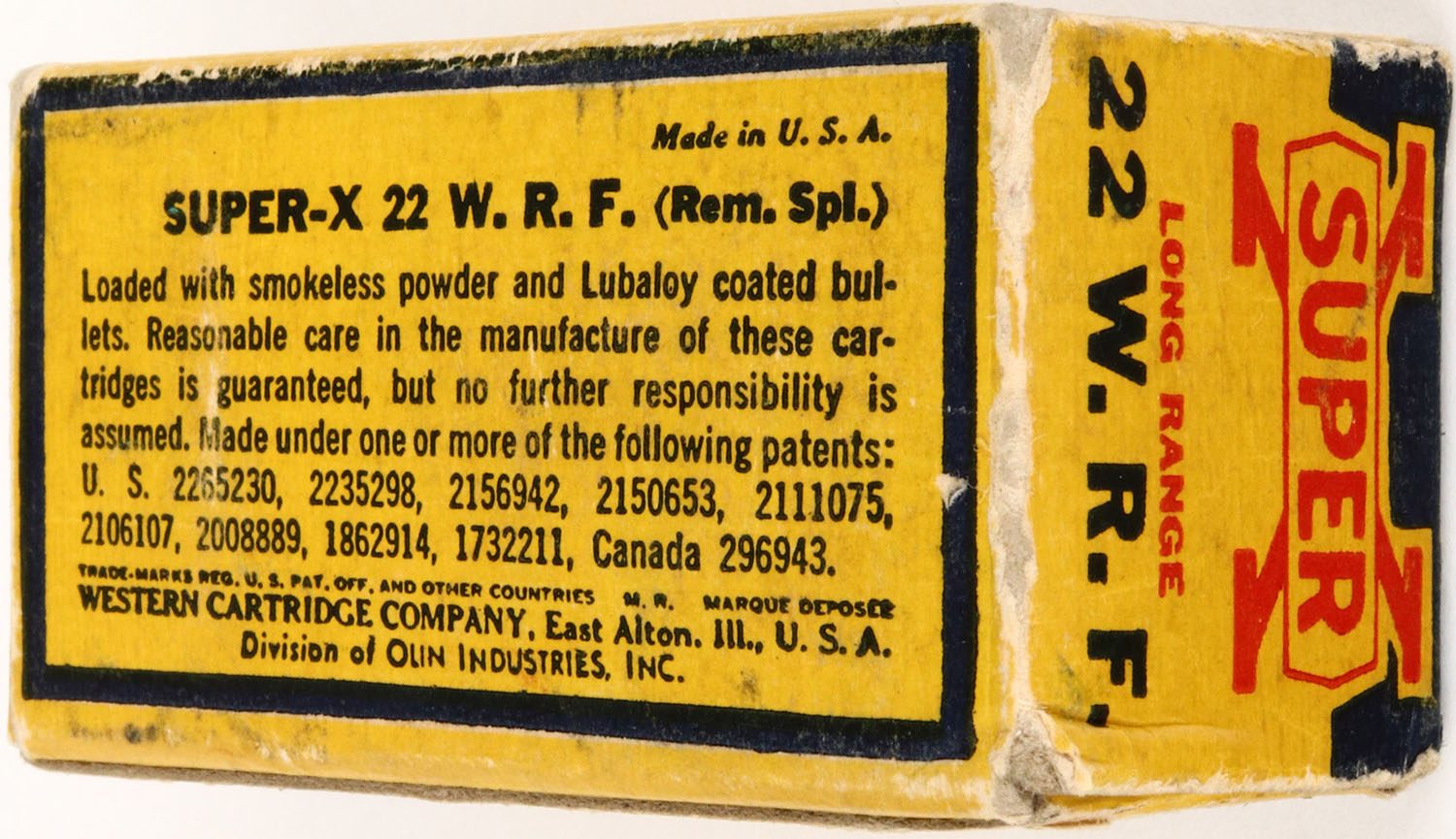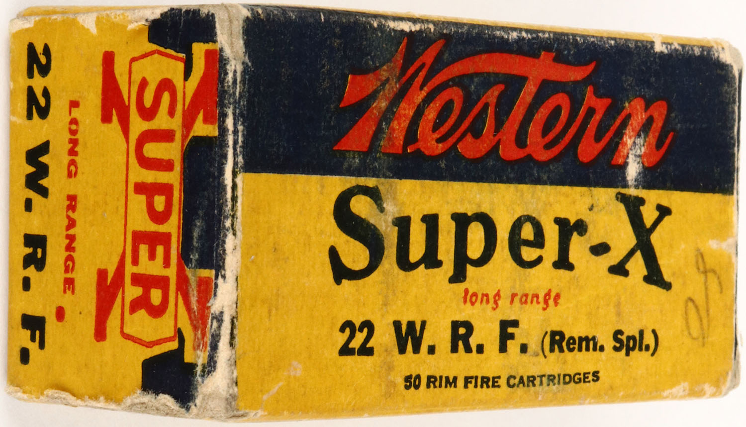 Western, Super-X, .22 W.R.F. (REM SPL.), 1pc., Full, yellow, blue & red box, Long Range, RHWeb: WCC-9 WRF-13, box is solid with very good colors, edge wear and has been written on top, ammo is very good. Grade: Very Good ++ - Value: 8 to 40