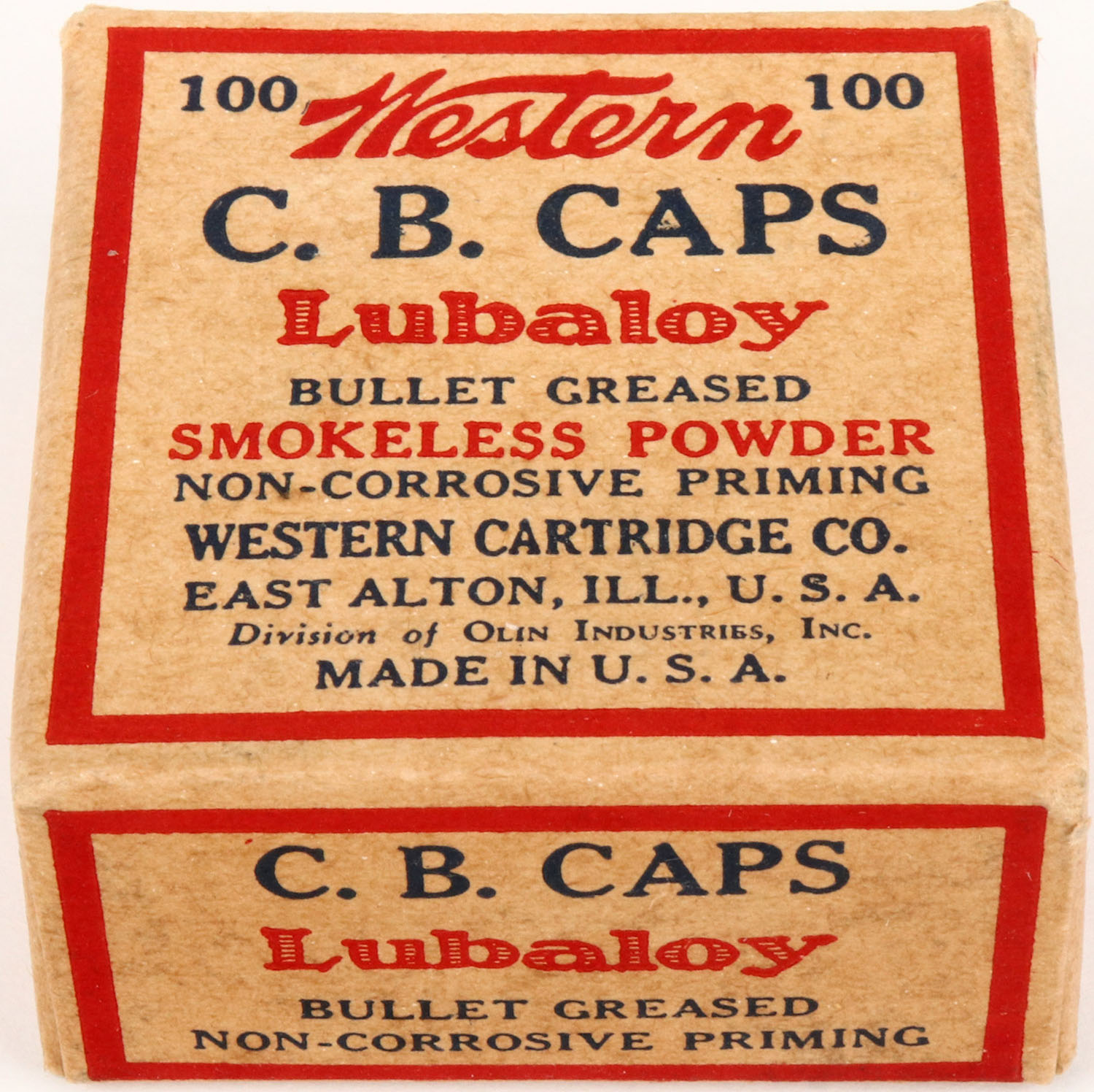 Western, C.B. Caps, Bullet Greased, RHWeb: WCC-99 CB-1e, Full, 1pc. Buff box with red & black printing, box is solid with excellent to minty color, very minor corner wear, edges are crisp, top flaps are solid, ammo is excellent. Grade: Excellent + - Value: 20 to 80