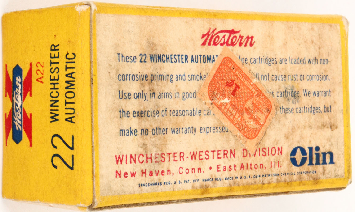 Western, X, .22 Winchester Automatic, A22, RHWeb: WCC-11 WA-1b, Full, 1pc. Yellow red & blue box, box is solid with very good color, some age soiling, very minor corner wear, edges are mostly crisp, top has been written on, Tennessee ammo tax stamp on bottom, end flaps are solid, ammo is excellent. Grade: Excellent + - Value: 20 to 60
