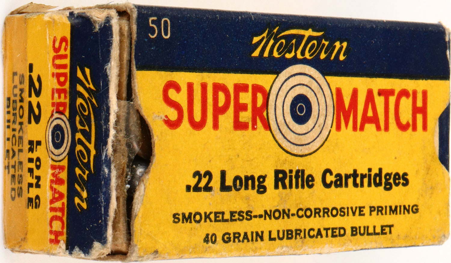 Western, Super Match, .22 Long Rifle, RHWeb: WCC-51.1 LR-2a, Full, 1pc. Yellow blue & red box, box has excellent color, both end flaps are torn, left end flap is missing tab,, minor corner wear, edges are crisp, ammo is excellent. Grade: Very Good + - Value: 2 to 20