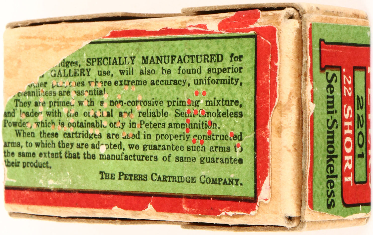 Peters, .22 Short, Semi-Smokeless Powder, RHWeb: PCC-5B S-1c, Full, 2pc. Buff box with green & red wraparound label, box is solid with excellent color, very minor edge & corner wear, bottom label is 90% intact, some age soiling, ammo is very good. Grade: Excellent - Value: 10 to 50