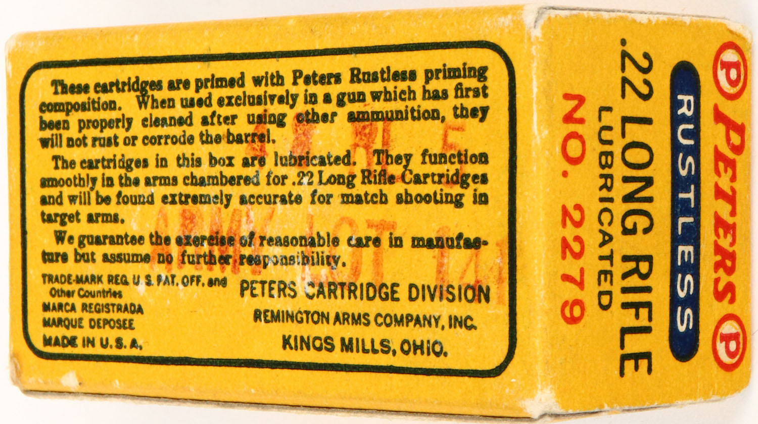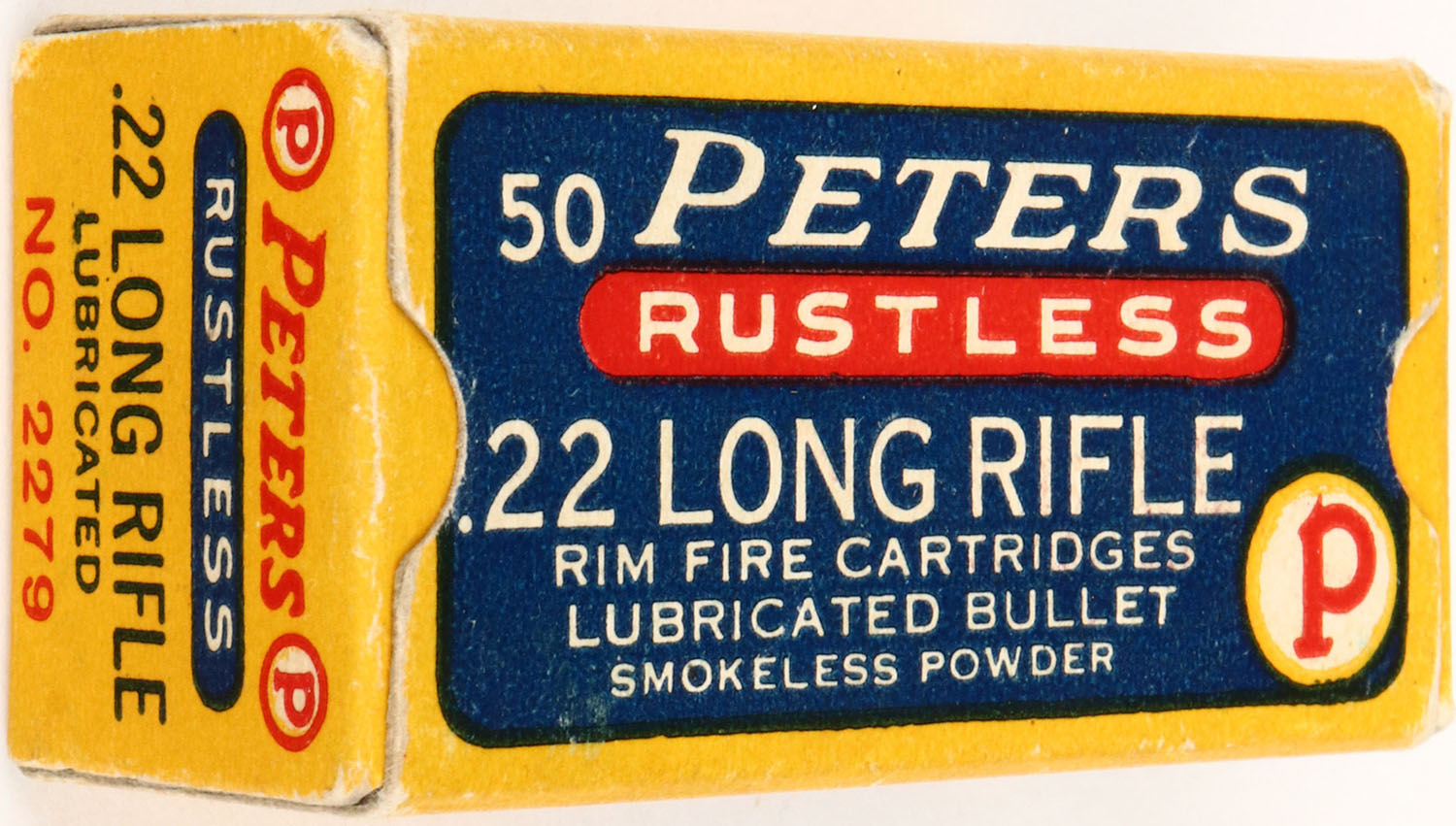 Peters, Rustless, .22 Long Rifle, RHWeb: PCC-8B LR-2, Full, 1pc. Blue yellow & red box, box is near mint with minty color, very minor corner wear, edges are crisp, end flaps are rigid, ammo is very good to excellent. Grade: Excellent ++ - Value: 10 to 50