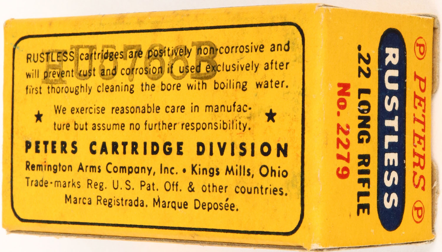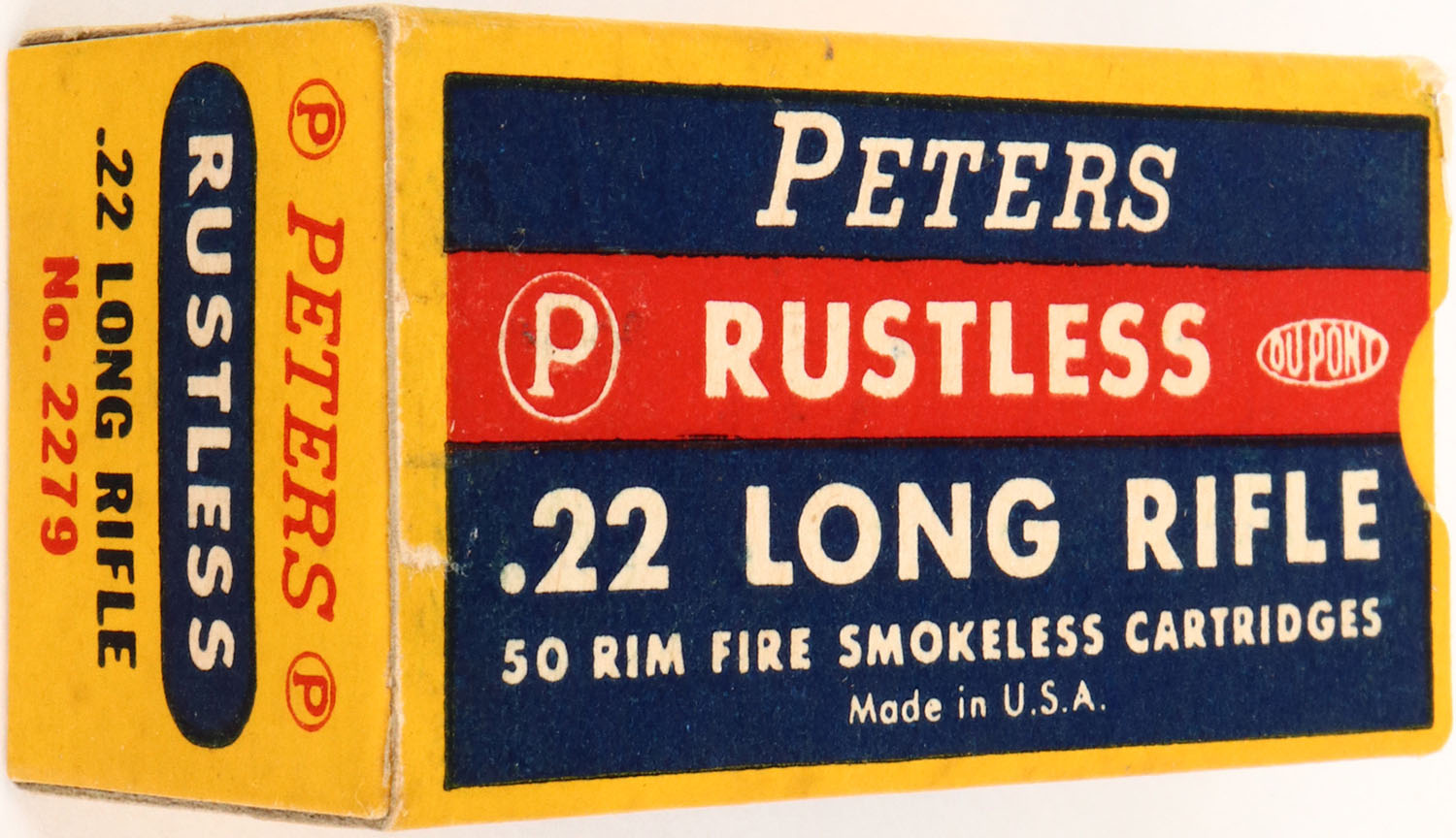 Peters, Rustless, .22 Long Rifle, RHWeb: PCC-8D LR-3f, Full, 1pc. Blue yellow & red box, box is solid with minty color, very minor corner wear, small indent on top, corners are very crisp, end flaps are very rigid, ammo is excellent. Grade: Excellent ++ - Value: 10 to 40
