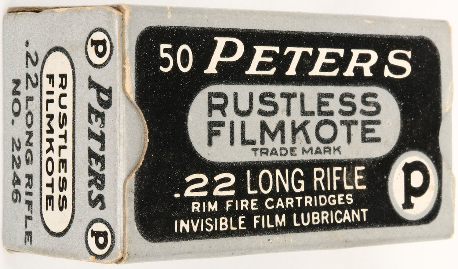 Peters, Rustless Filmkote, .22 Long Rifle, RHWeb: PCC-12 LR-1a, Full, 1pc. Silver & black box, box is solid with excellent color, very minor age soiling & edge wear, corners are mostly sharp, end flaps are solid, ammo is excellent. Grade: Excellent ++ - Value: 10 to 40