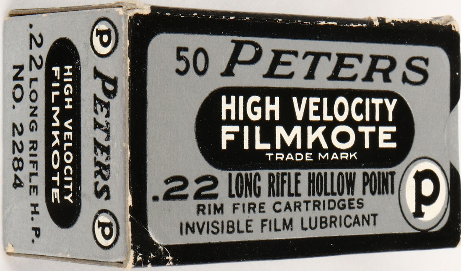 Peters, High Velocity Filmkote, .22 Long Rifle, RHWeb: PCC-13 LR-2g, Full, 1pc. Silver black & white box, box is solid with excellent to minty color, minor corner wear, edges are mostly crisp, end flaps are rigid, ammo is excellent. Grade: Excellent ++ - Value: 10 to 50