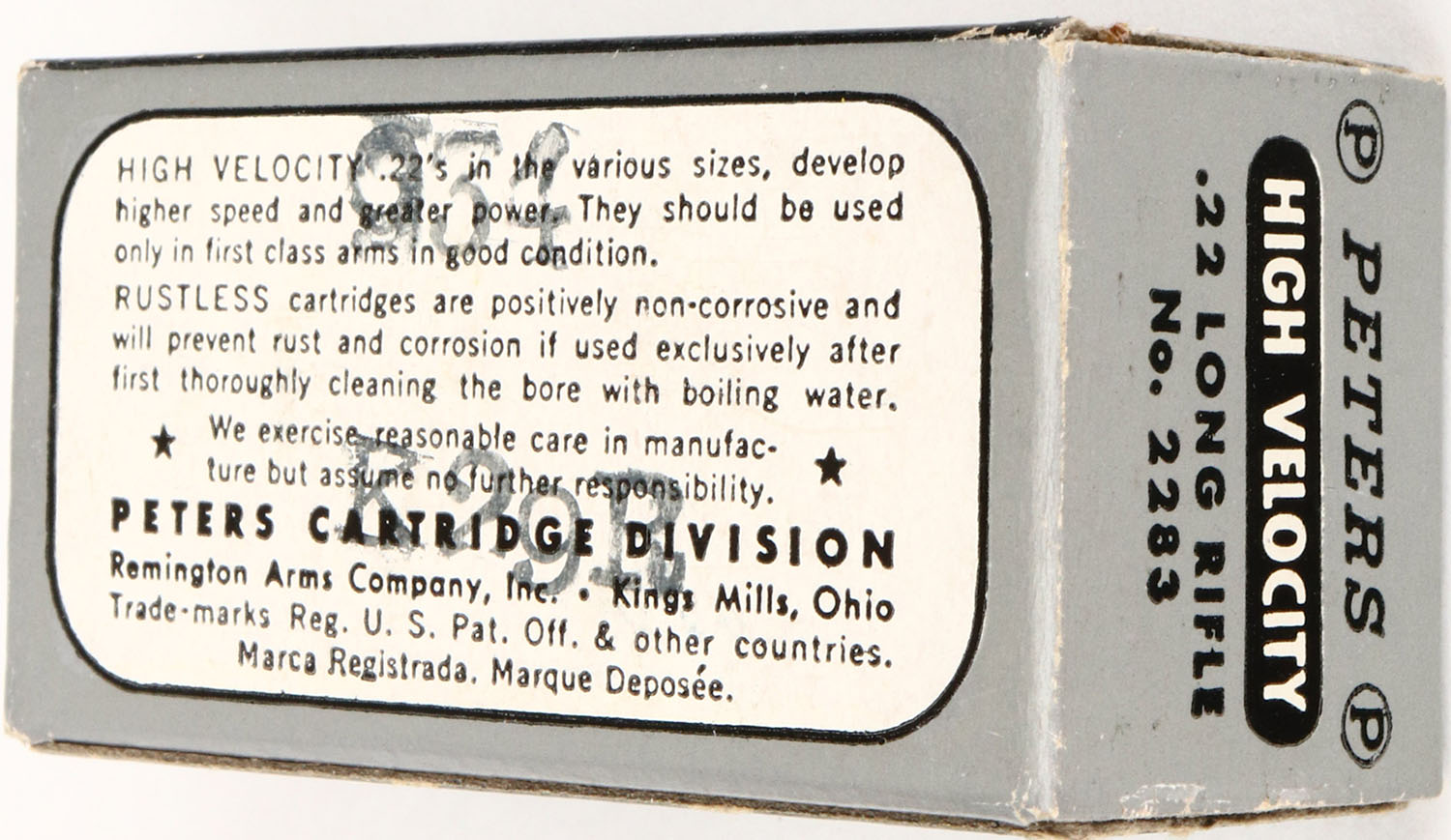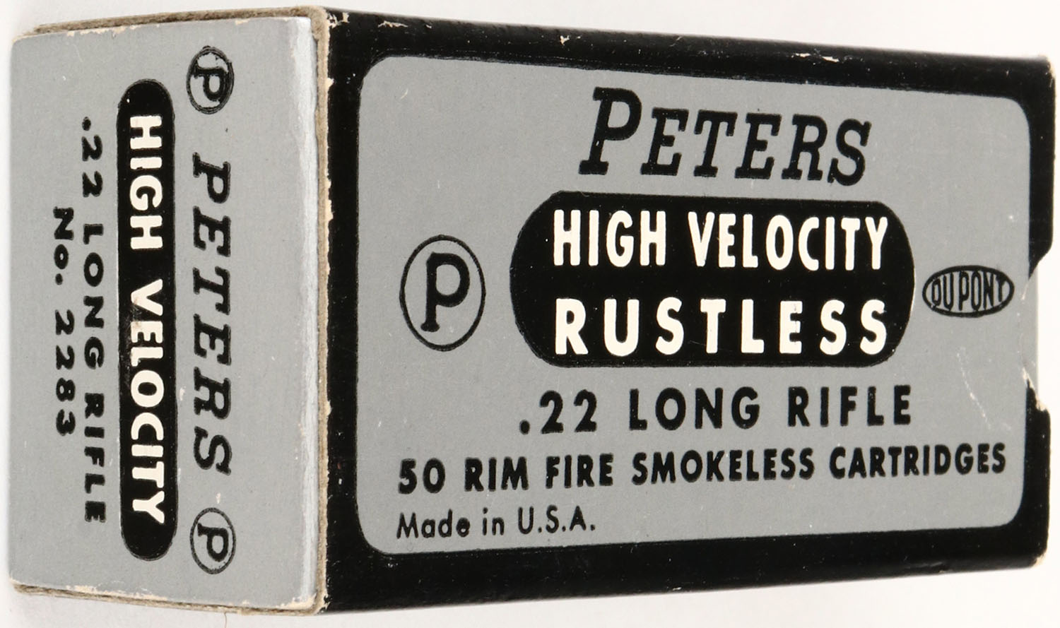 Peters, High Velocity Rustless, .22 Long Rifle, RHWeb: PCC-14 LR-1aa, Full, 1pc. Silver black & white box, box is near mint with minty color, only very minor corner wear, edges are crisp, end flaps are rigid, ammo is excellent. Grade: Mint - Value: 10 to 50